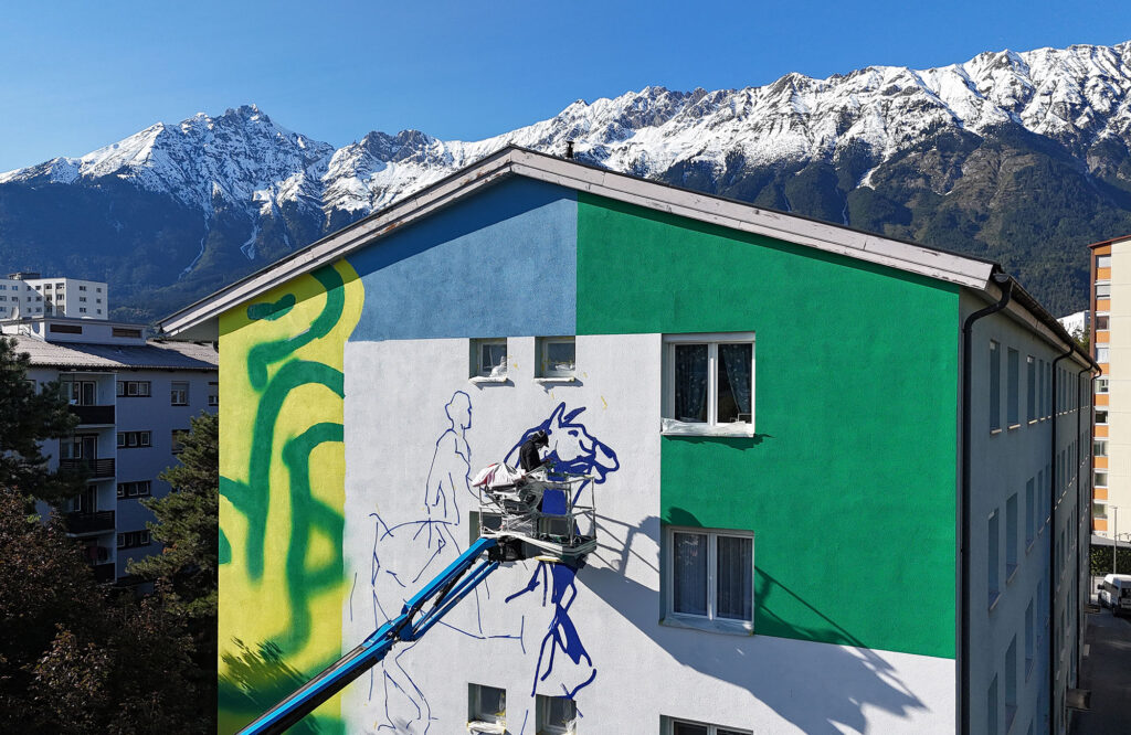 Für das diesjährige Festival wurde von 16 – 20. September die Bemalung eines Gebäudes in der Durigstraße 24 in Innsbruck umgesetzt. Die beiden beteiligten Künstler Maximilian Prantl aka HNRX und „Dr. Kartelović“ (Eugen Cuncev) aus Berlin haben gemeinsam an ihrem Kunstwerk gearbeitet und abwechselnd ihre Parts auf der Wand zum Leben erweckt. Die Künstler, die immer wieder an gemeinsamen Projekten arbeiten, da sich ihre Stile gut kombinieren lassen und gegenseitig ergänzen, haben das Motiv zusammen entwickelt. Nach den vorbereitenden Arbeiten und dem Fassadenstreichen am Montag bei fast winterlichen Verhältnissen, entstand das Kunstwerk dann im Laufe der Woche bei viel Sonnenschein.