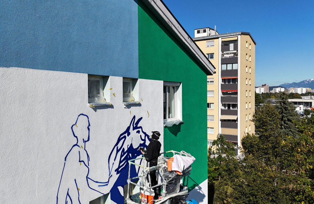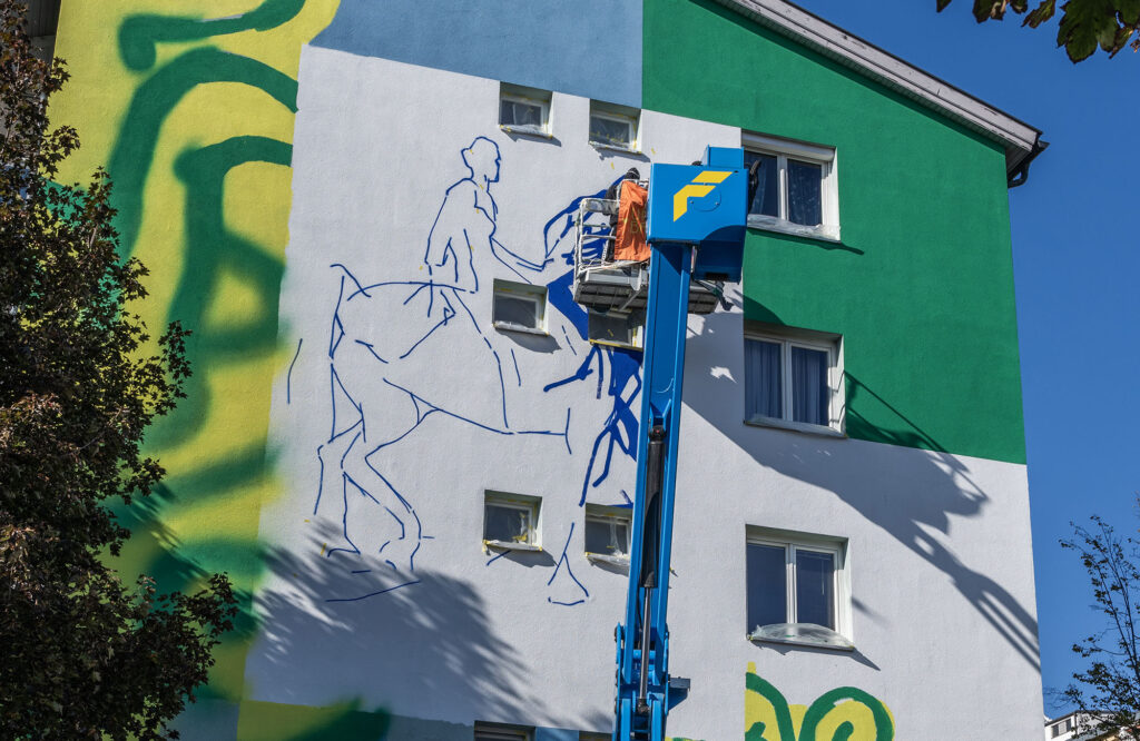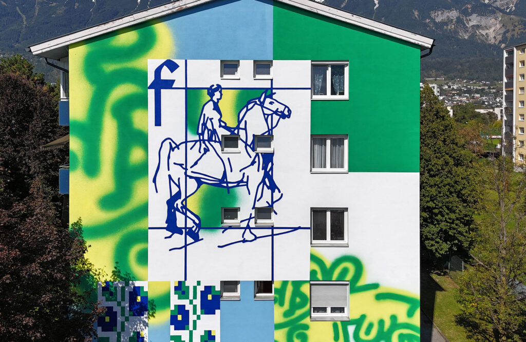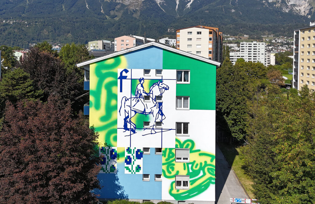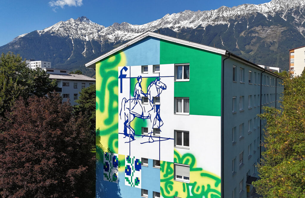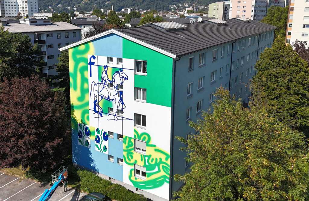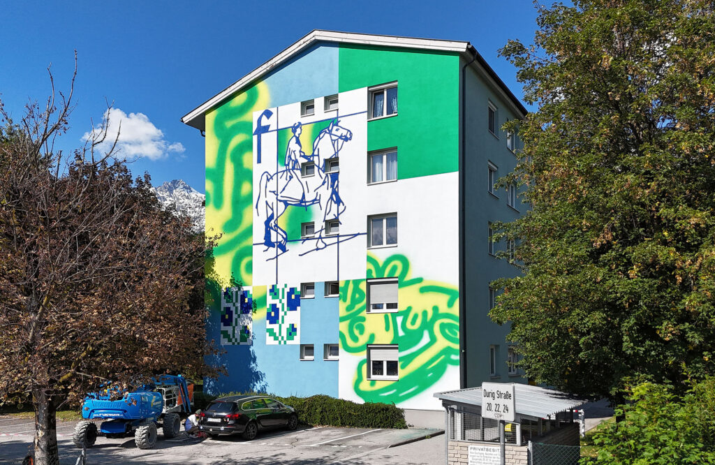 Das Motiv mit einem Reiter und einem f als Verweis auf die – hinter dem Gebäude liegende – Frau Hitt haben die beiden gemeinsam für diesen Standort entwickelt und wollten erreichen, dass es vor allem farblich gut zu Bergen, Natur und Himmel im Hintergrund passt, sich jedoch gleichzeitig mit dem gelb-grünen Kontrast davon abhebt. Die charakteristischen Blumen, die stilisierte Enziane darstellen, unterstreichen ebenfalls den regionalen Bezug des Motivs. Spannend zu beobachten war, dass der ursprüngliche Entwurf im Laufe der Ausführungen noch adaptiert wurde. Die Künstler meinten dazu: „Entwürfe sind eben immer nur Entwürfe und das Endresultat entsteht bei unseren Kunstaktionen immer erst auf der Wand.“ Das sei für den Prozess wichtig und sorge dafür, dass vor Ort einzigartige Kunstwerke entstehen.
