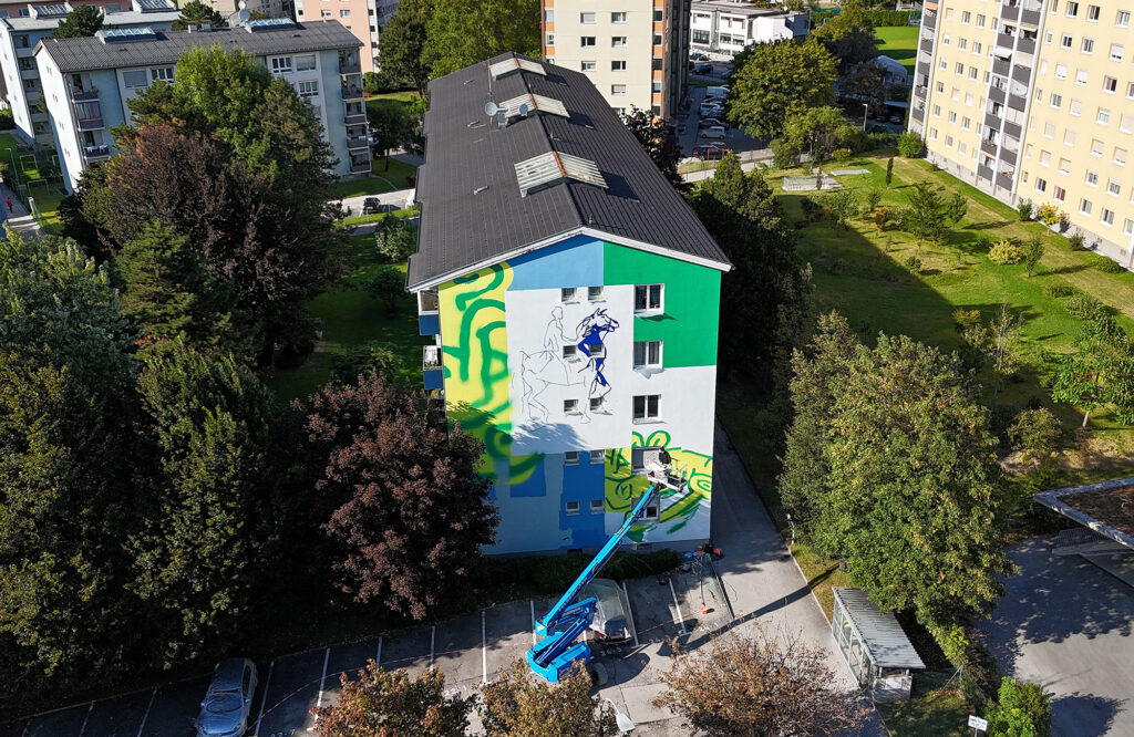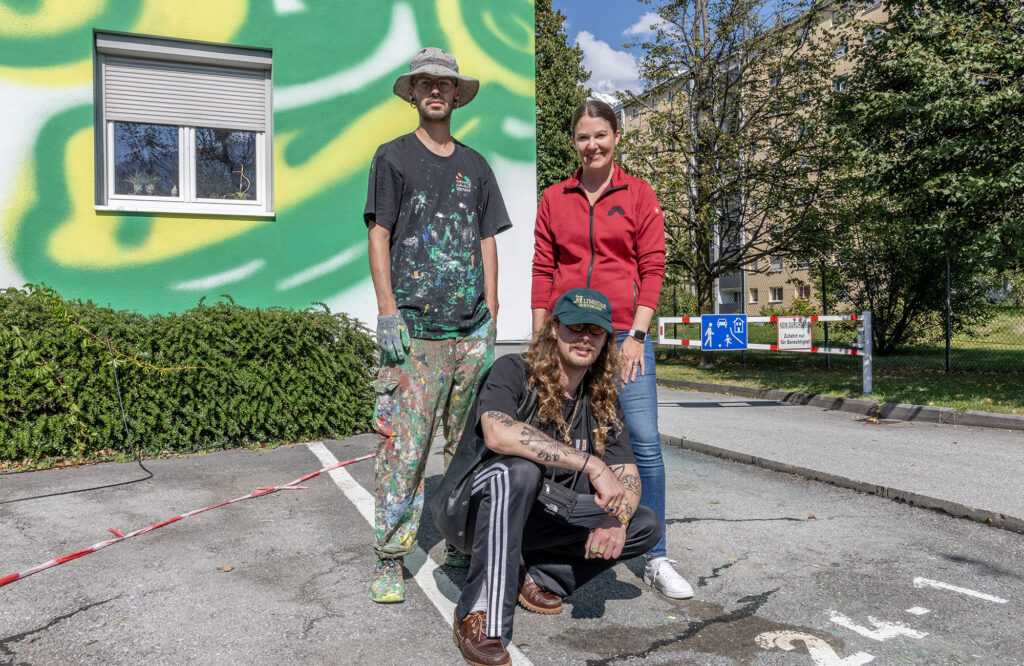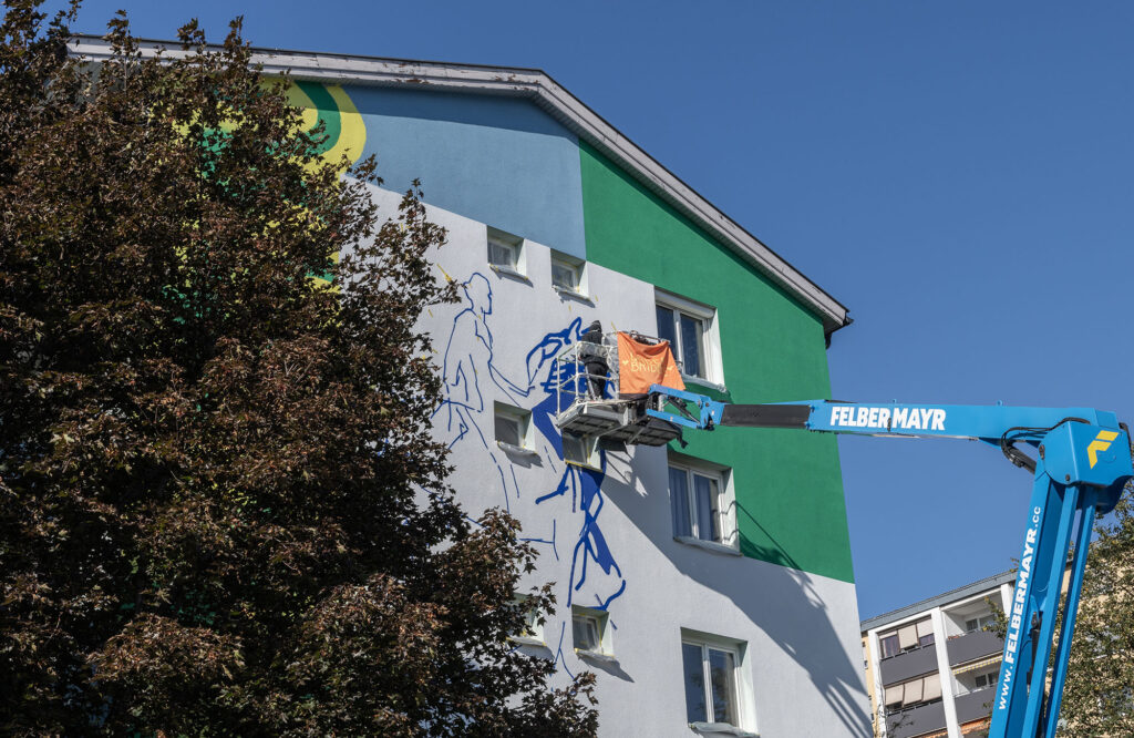 Geschäftsführerin Cornelia Springer machte sich Samstag am frühen Nachmittag selbst ein Bild von der fertigen Wandgestaltung. „Auch für uns ist es immer wieder spannend zu sehen, was die Künstler auf den Fassadenflächen erschaffen, die wir ihnen als Alpenländische dafür gerne zur Verfügung stellen. Ich bedanke mich bei den Organisatoren des Underbridge-Festivals und beteiligten Künstlern für ihren kreativen Einsatz und bei den Bewohner:innen dieser Wohnanlage für ihr Interesse und Neugierde an diesem Projekt und wünsche allen viel Freude mit diesem neuen Kunstwerk, das nun zwischen den anderen Gebäuden schon von weitem in’s Auge sticht.“