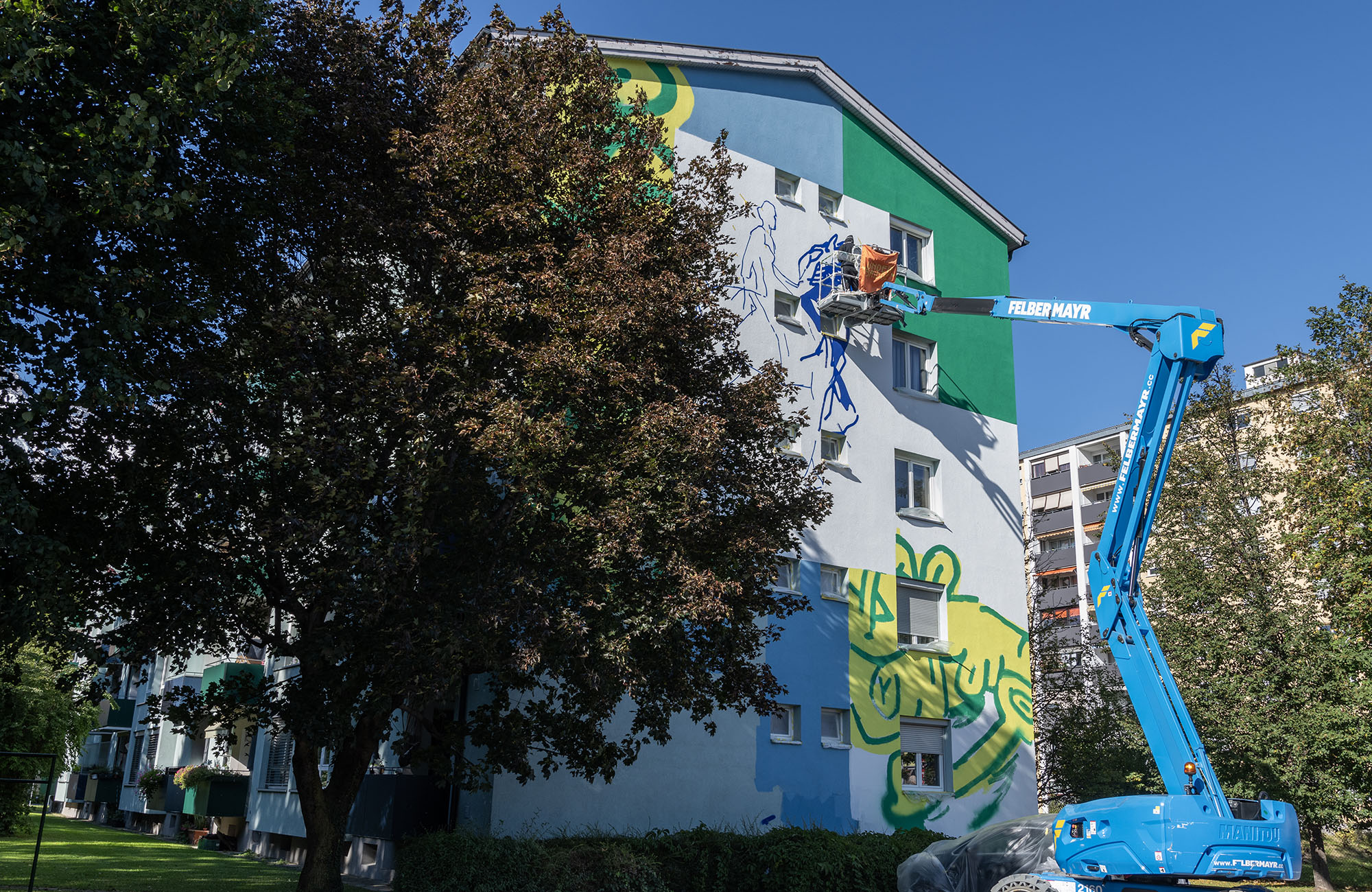 Geschäftsführerin Cornelia Springer machte sich Samstag am frühen Nachmittag selbst ein Bild von der fertigen Wandgestaltung. „Auch für uns ist es immer wieder spannend zu sehen, was die Künstler auf den Fassadenflächen erschaffen, die wir ihnen als Alpenländische dafür gerne zur Verfügung stellen. Ich bedanke mich bei den Organisatoren des Underbridge-Festivals und beteiligten Künstlern für ihren kreativen Einsatz und bei den Bewohner:innen dieser Wohnanlage für ihr Interesse und Neugierde an diesem Projekt und wünsche allen viel Freude mit diesem neuen Kunstwerk, das nun zwischen den anderen Gebäuden schon von weitem in’s Auge sticht.“
