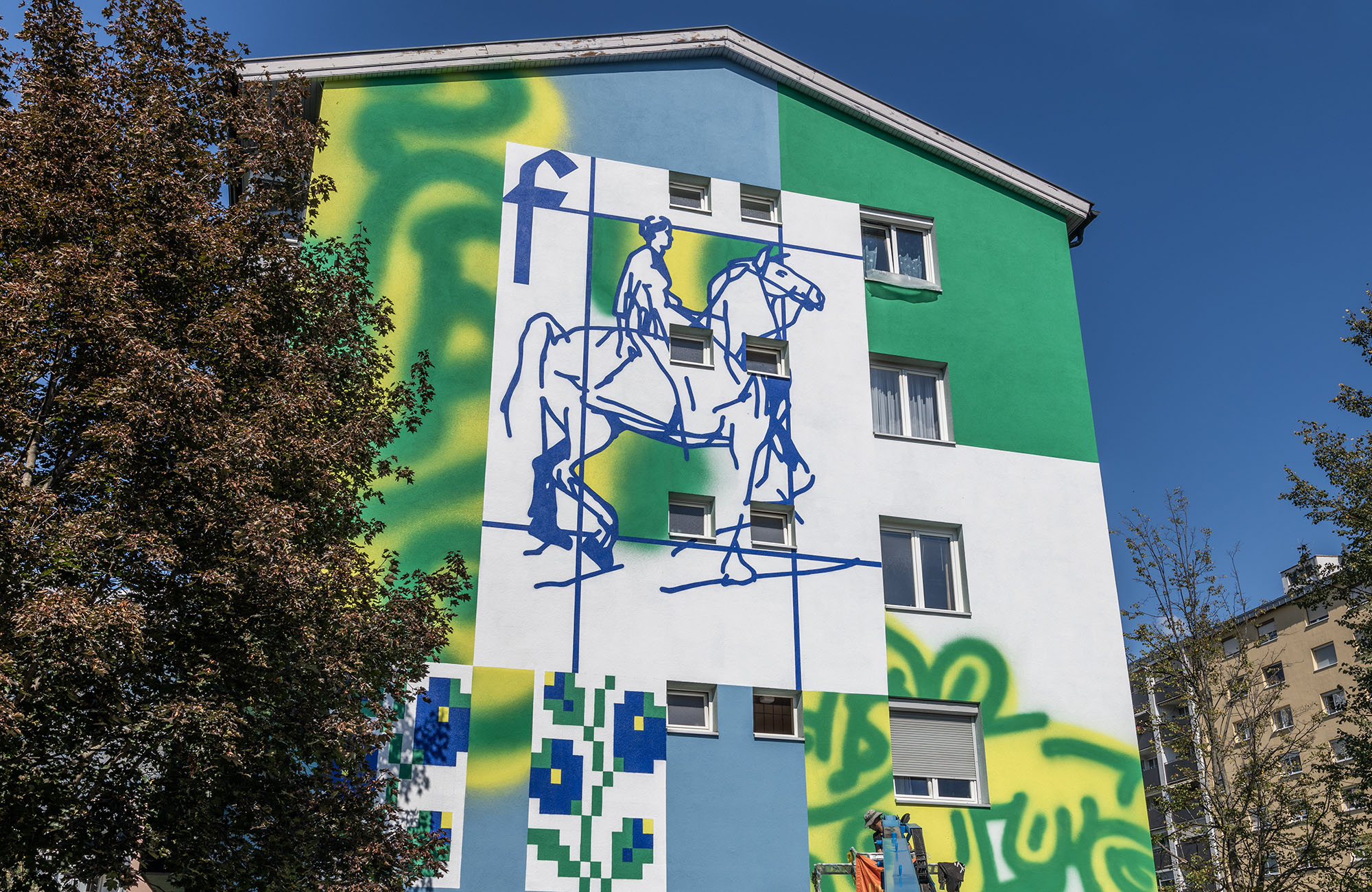 Das Motiv mit einem Reiter und einem f als Verweis auf die – hinter dem Gebäude liegende – Frau Hitt haben die beiden gemeinsam für diesen Standort entwickelt und wollten erreichen, dass es vor allem farblich gut zu Bergen, Natur und Himmel im Hintergrund passt, sich jedoch gleichzeitig mit dem gelb-grünen Kontrast davon abhebt. Die charakteristischen Blumen, die stilisierte Enziane darstellen, unterstreichen ebenfalls den regionalen Bezug des Motivs. Spannend zu beobachten war, dass der ursprüngliche Entwurf im Laufe der Ausführungen noch adaptiert wurde. Die Künstler meinten dazu: „Entwürfe sind eben immer nur Entwürfe und das Endresultat entsteht bei unseren Kunstaktionen immer erst auf der Wand.“ Das sei für den Prozess wichtig und sorge dafür, dass vor Ort einzigartige Kunstwerke entstehen.