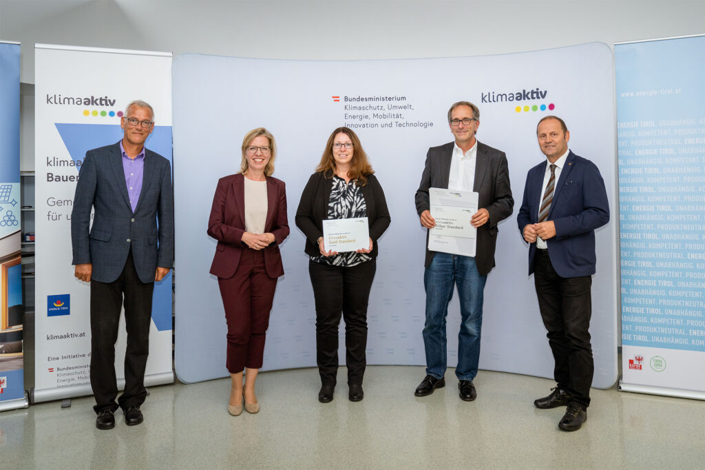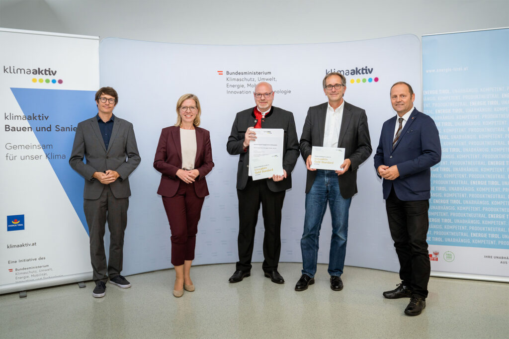 Bei der Verleihung der klimaaktiv-Auszeichnungen im Sommer 2021 wurden in Anwesenheit von Frau Bundesministerin Leonore Gewessler zahlreiche Projekte der gemeinnützigen WohnbauGmbH geehrt. Die Alpenländische bleibt Spitzenreiter im österreichischen Vergleich.