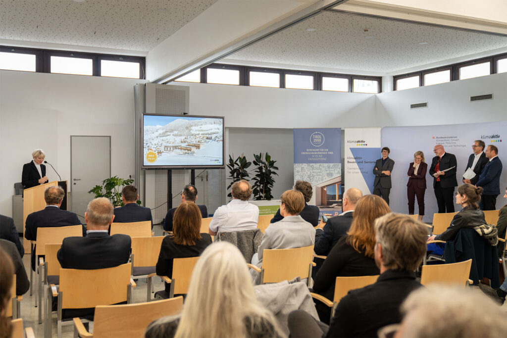 Klimaschutzministerin Leonore Gewessler, LHStv. Josef Geisler, DI Robert Taunmüller (Energie Tirol), DI Markus Lechleitner und Harald Stöger (Alpenländische Gemeinnützige WohnbauGmbH)