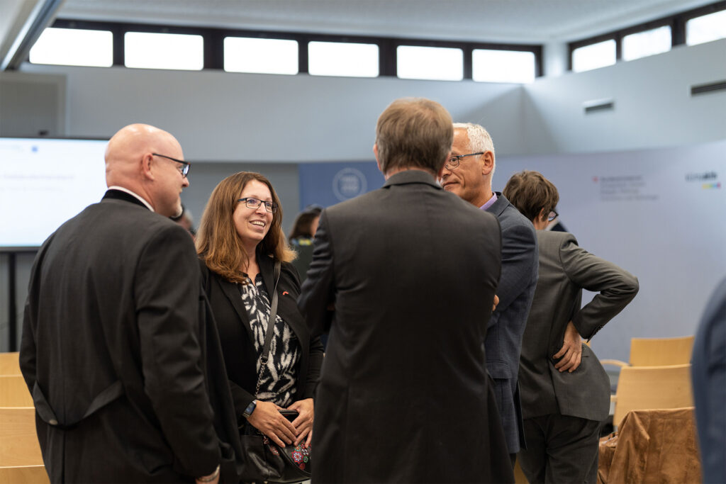 v.l.n.r.: Josef Burtscher (Energieinstitut Vorarlberg), Klimaschutzministerin Leonore Gewessler, Prok.in Alexandra Schalegg und GF DI Markus Lechleitner (beide Alpenländische Gemeinnützige WohnbauGmbH) und LHStv. Josef Geisler