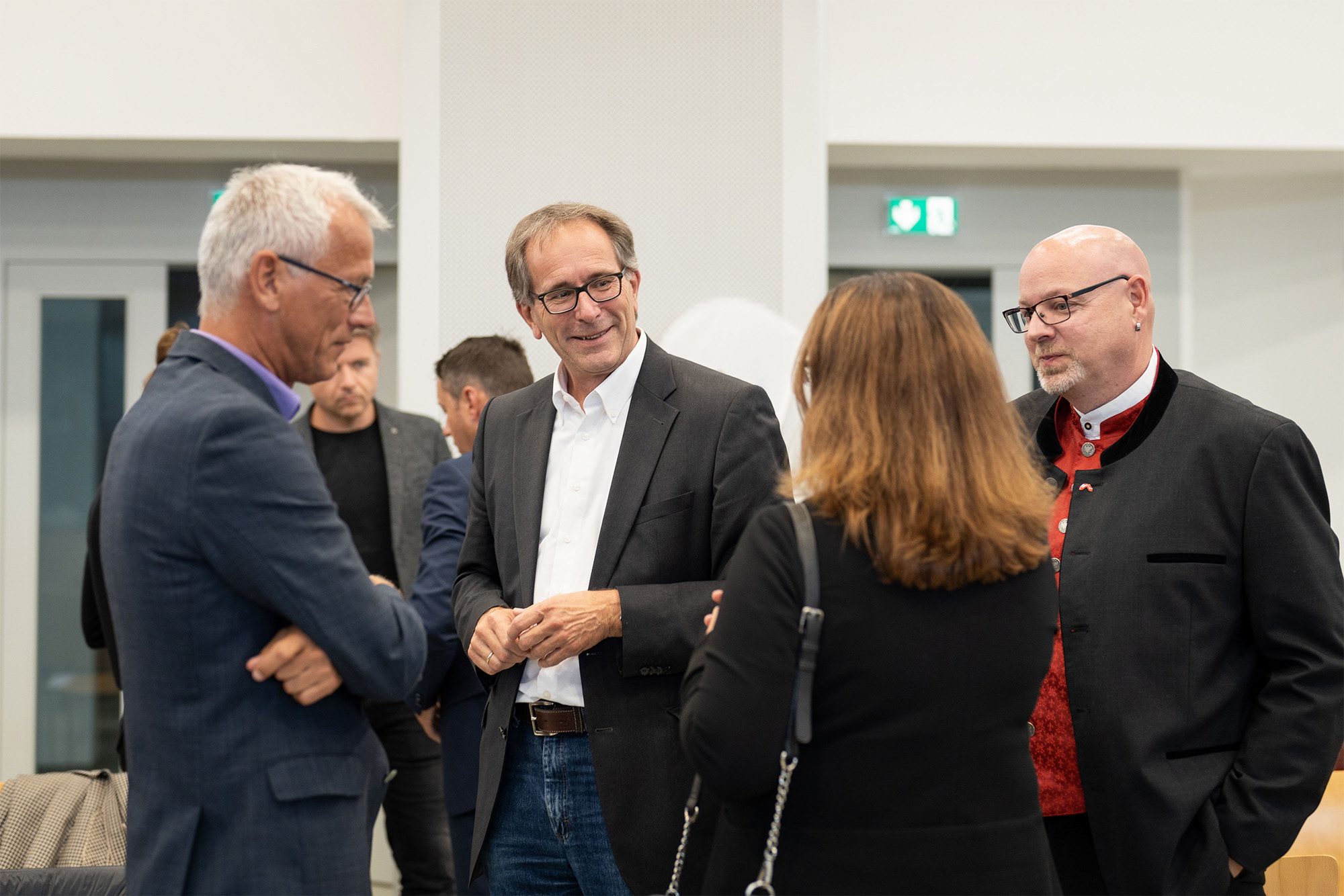 v.l.n.r.: Josef Burtscher (Energieinstitut Vorarlberg), Klimaschutzministerin Leonore Gewessler, Prok.in Alexandra Schalegg und GF DI Markus Lechleitner (beide Alpenländische Gemeinnützige WohnbauGmbH) und LHStv. Josef Geisler