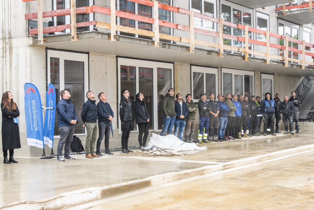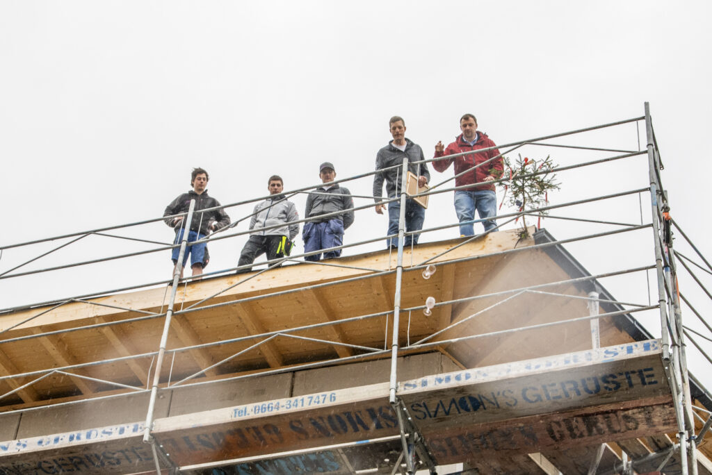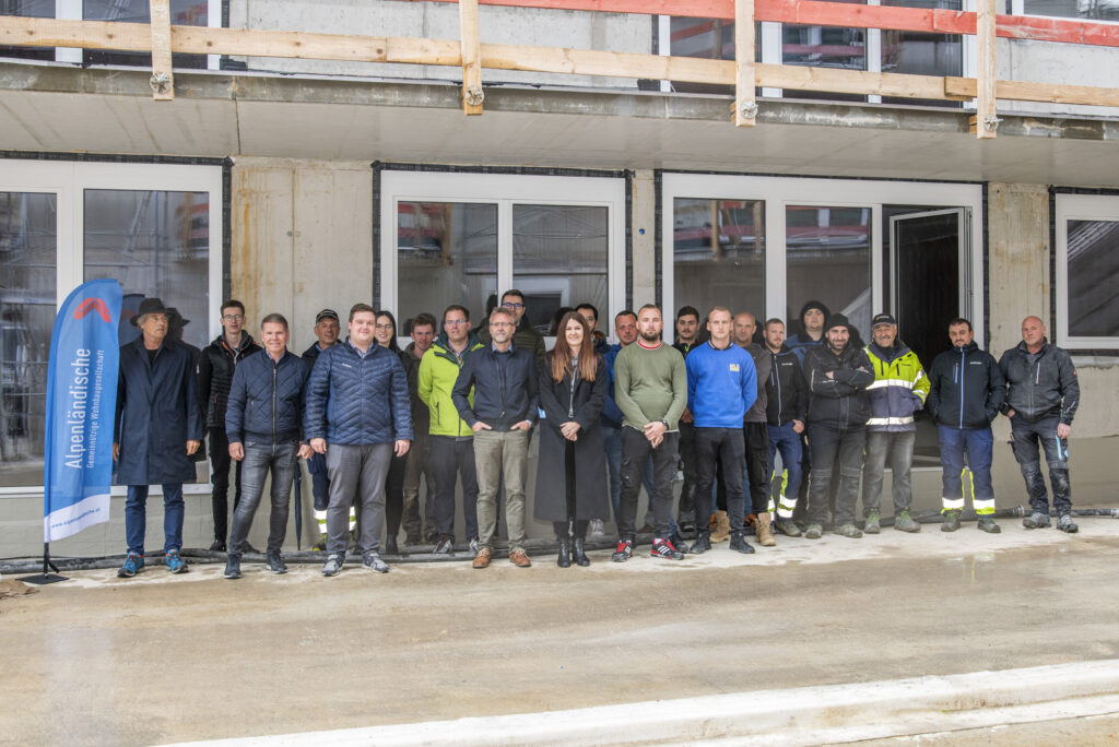 Bürgermeister Rene Schwaiger freute sich gemeinsam mit zahlreichen Teilnehmern über das rasch voranschreitende Bauvorhaben der Alpenländischen: „Nachdem ich lieber anpacke als rede, möchte ich mich kurzhalten und anmerken, dass es für unsere Gemeinde sehr wichtig ist, leistbaren Wohnraum zur Verfügung zu stellen und es eine essenzielle Aufgabe ist, die Bevölkerung in allen relevanten Belangen zu unterstützen – Stichwort betreutes Wohnen. In diesen Belangen ist die Alpenländische ein wichtiger Partner, wir arbeiten perfekt zusammen und haben bisher nur gute Erfahrungen gemacht. Ich freu mich ankündigen zu dürfen, dass bereits ein weiteres Projekt im Sinne von betreubarem Wohnen in der Gemeinde geplant ist.“
