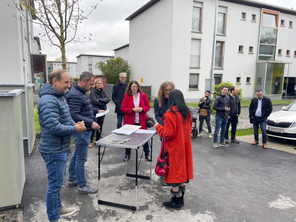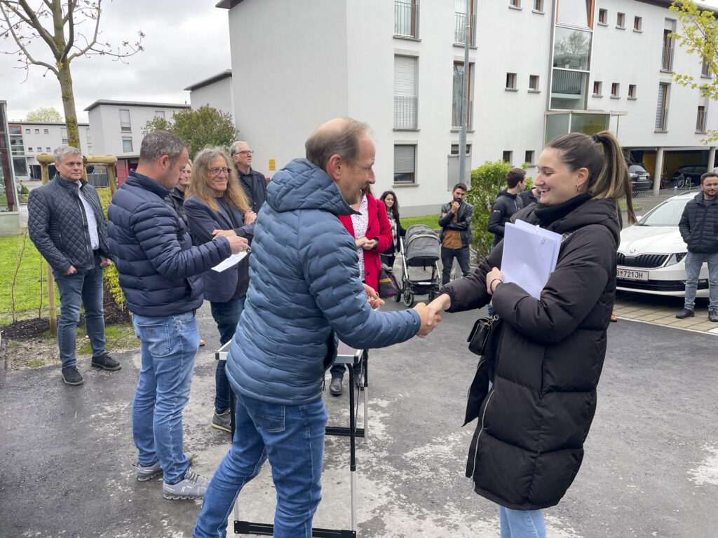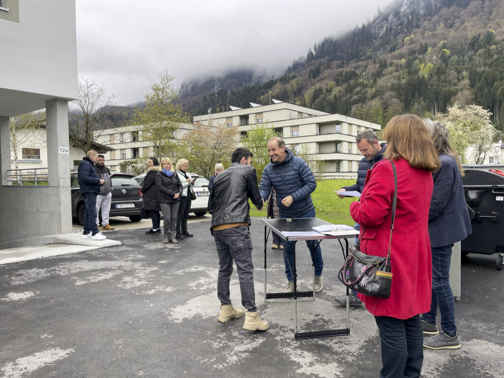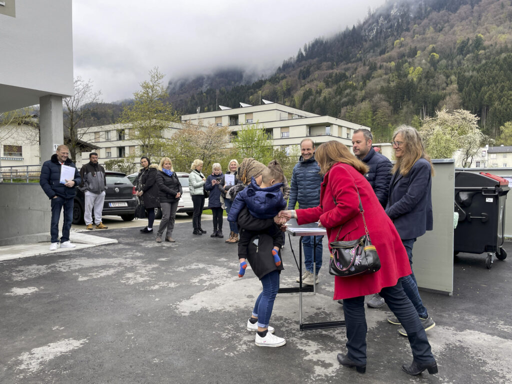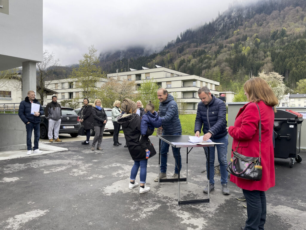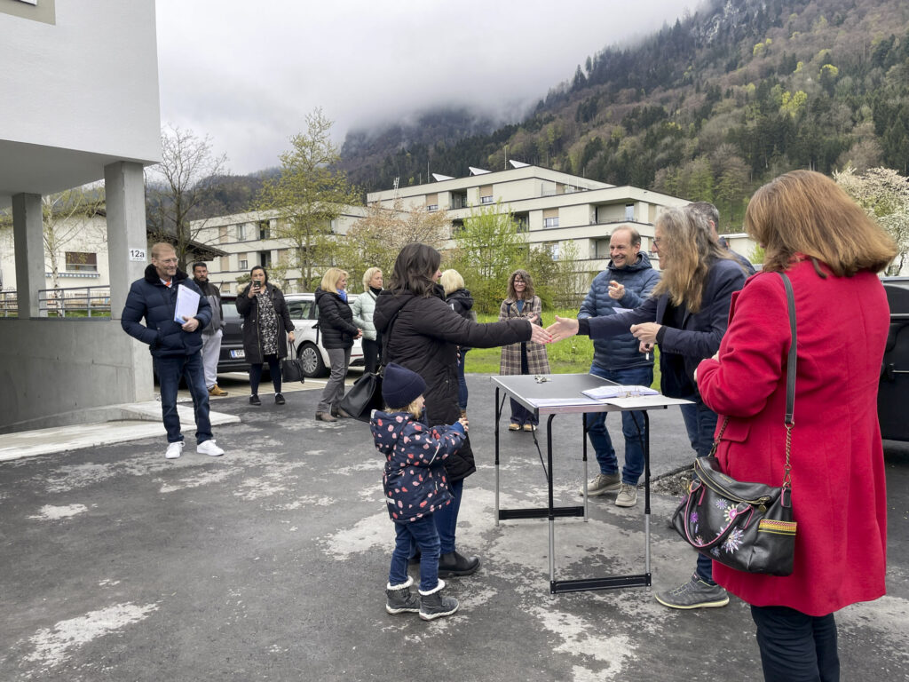 Der Bürgermeister der Stadt Hohenems Dieter Egger, die Alpenländische Gemeinnützige Wohnbau GmbH sowie weitere Projektbeteiligte wünschen den Bewohnern viel Freude in ihrem neuen Zuhause.