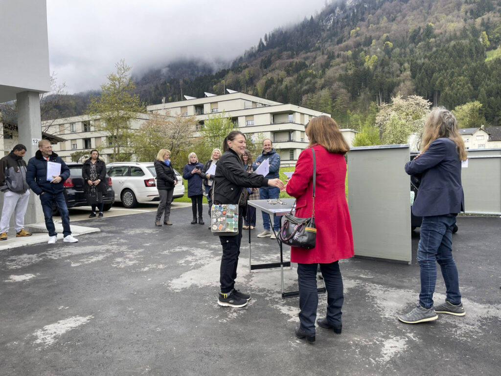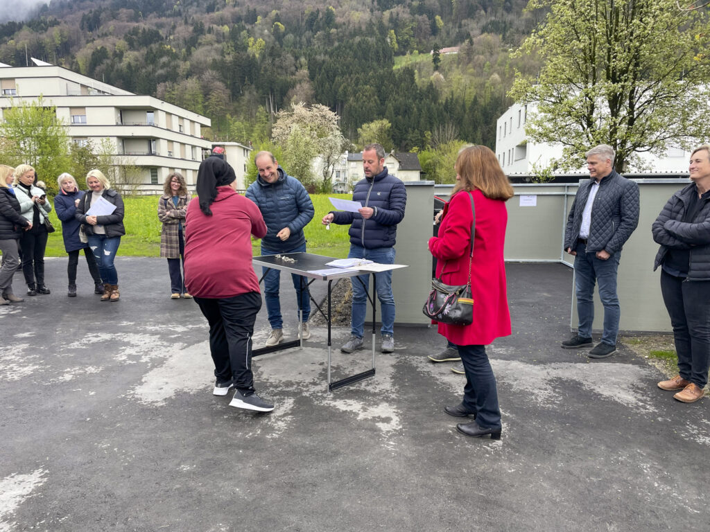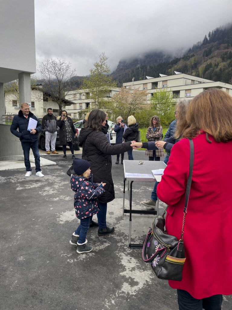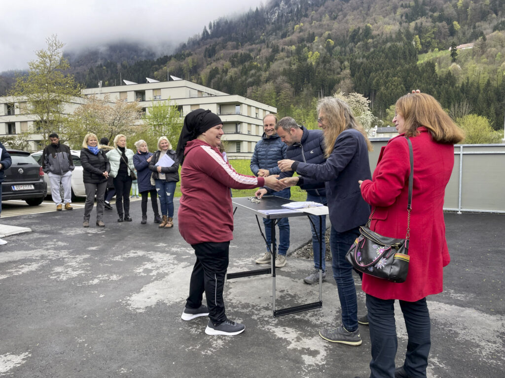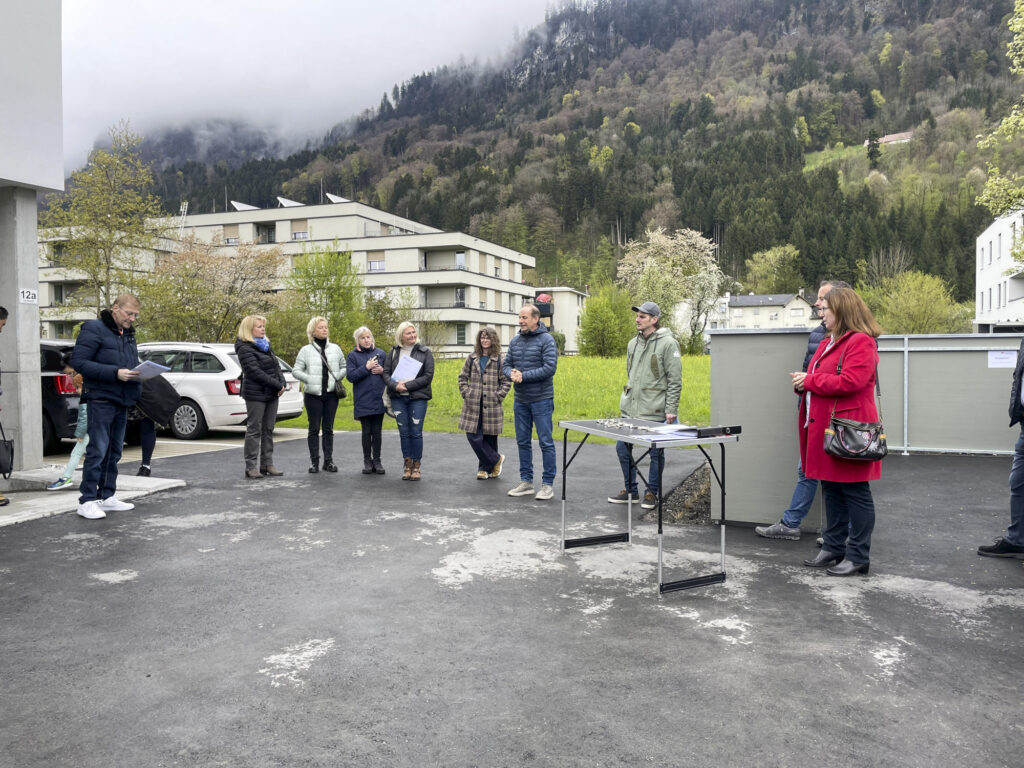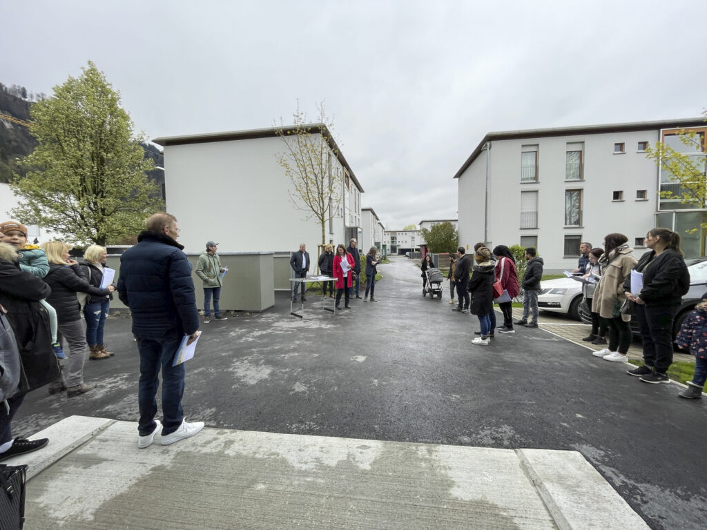Der Bürgermeister der Stadt Hohenems Dieter Egger, die Alpenländische Gemeinnützige Wohnbau GmbH sowie weitere Projektbeteiligte wünschen den Bewohnern viel Freude in ihrem neuen Zuhause.