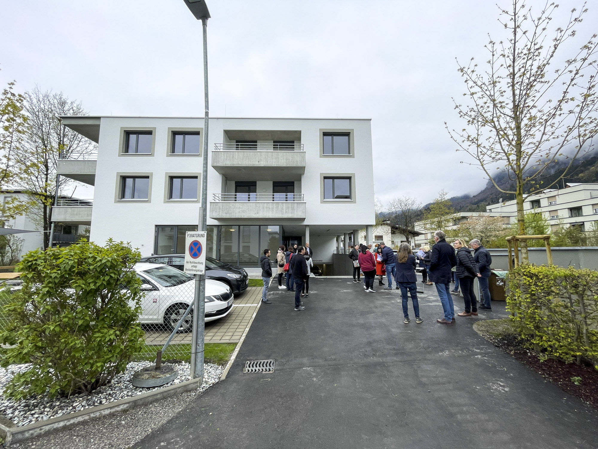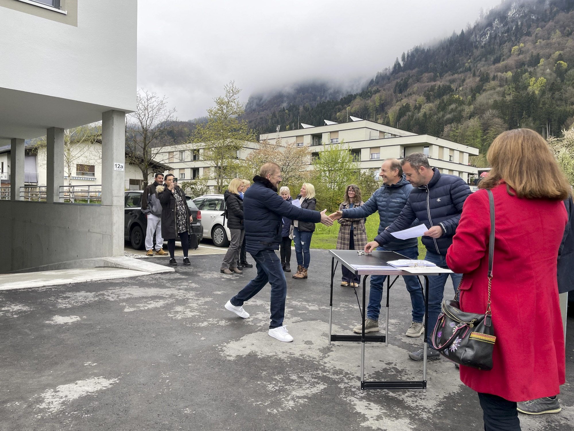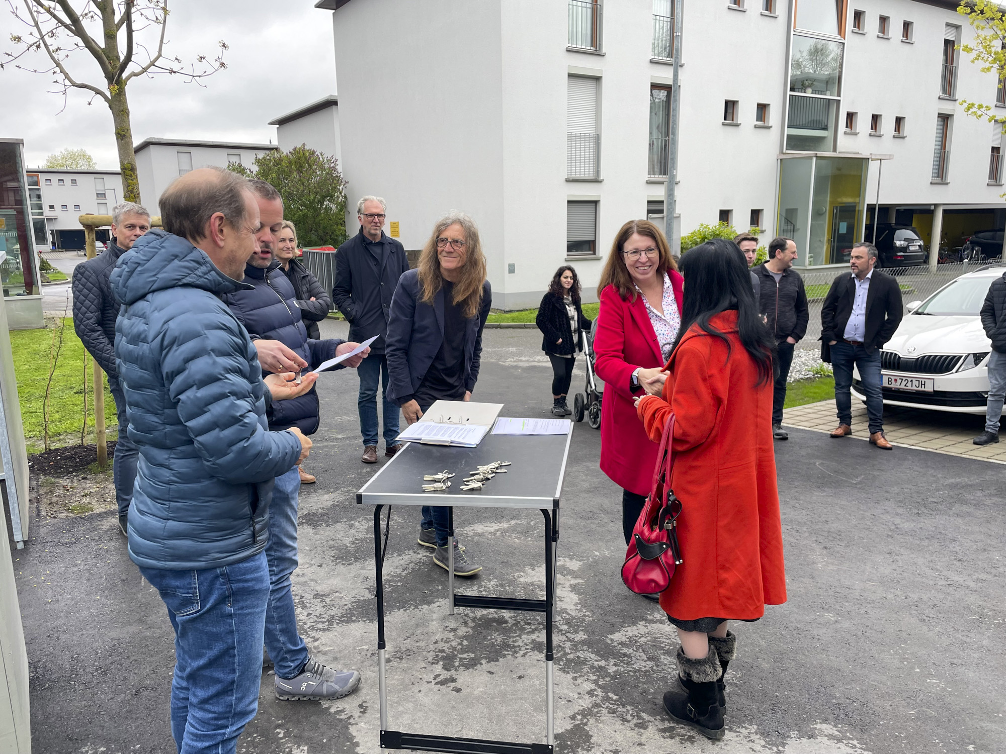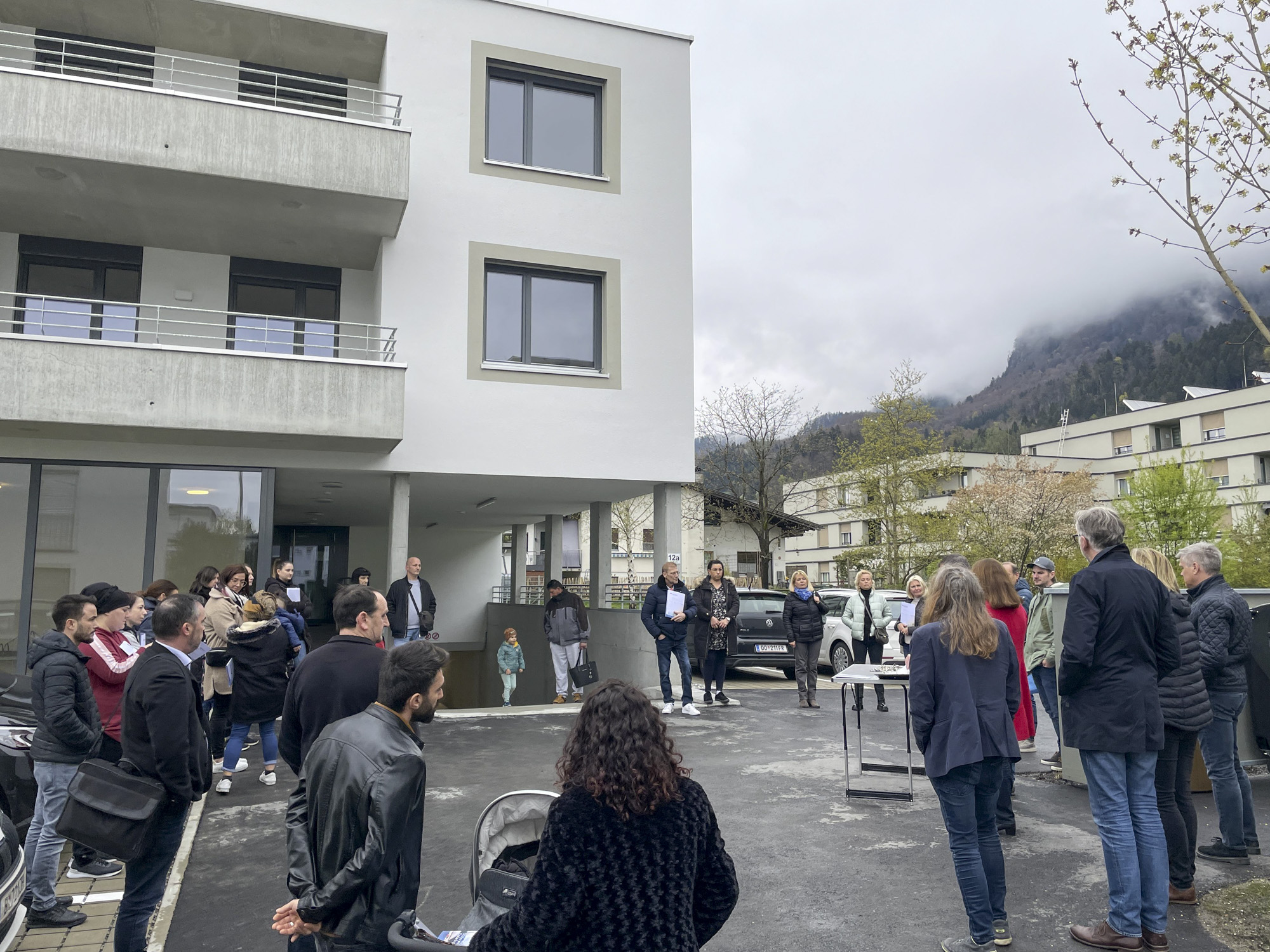 Der Bürgermeister der Stadt Hohenems Dieter Egger, die Alpenländische Gemeinnützige Wohnbau GmbH sowie weitere Projektbeteiligte wünschen den Bewohnern viel Freude in ihrem neuen Zuhause.