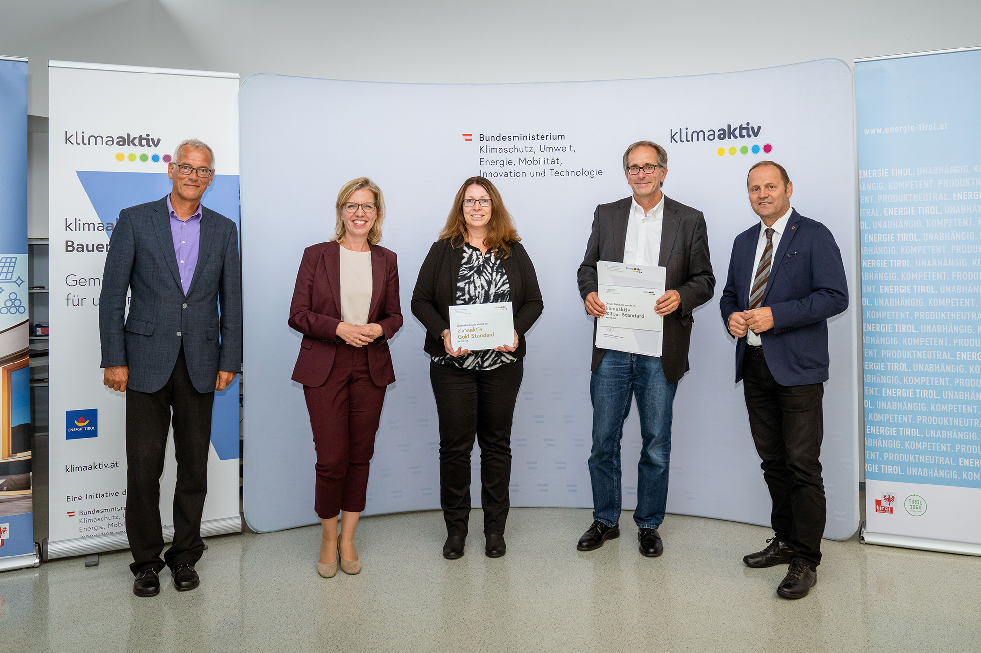 „Klimaaktiv Bauen und Sanieren“ ist eine Initiative des Klimaschutzministeriums. Seit 2004 wurden in Österreich über 1.120 Gebäude nach den Kriterien des klimaaktiv Gebäudestandards bewertet und deklariert. Etwa ein Drittel aller bislang deklarierten Gebäude kommen aus Tirol, wie Landeshauptmann-Stellvertreter Josef Geisler in seiner Ansprache hervorhob. Bei der diesjährigen Verleihung werden 35 Projekte mit „Gold“ ausgezeichnet, die in den Jahren 2020 und 2021 fertiggestellt wurden. Mehr als die Hälfte dieser höchst-prämierten Gebäude hat die Alpenländische errichtet.