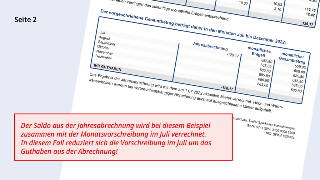 Der Saldo aus der Jahresabrechnung wird zusammen mit der Monatsvorschreibung im zweifolgenden Monat verrechnet! z.B.: Bei Zustellung der Abrechnung im Mai ist die Fälligkeit mit Juli gegeben.
