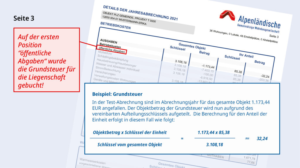 Für die Begleichung der Betriebskosten der Liegenschaft werden monatliche Akontobeträge eingehoben. Die Werte sind aufgrund von Erfahrungswerten in anderen Wohnanlagen kalkuliert und werden im Zuge der Jahresabrechnung bezogen auf ein Kalenderjahr jeweils bis 30.6. des Folgejahres den tatsächlichen Aufwendungen gegenübergestellt. Die Differenzbeträge werden jeweils dem Wohnungskonto gutgeschrieben bzw. angelastet.