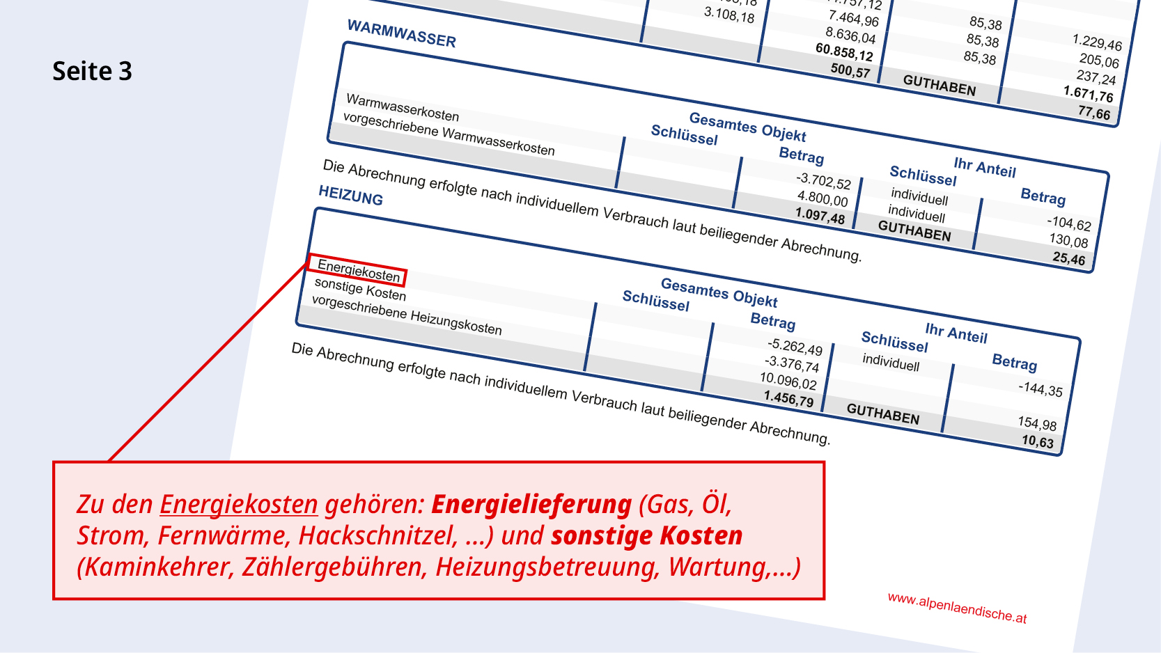 Bei der Aufteilung des Heizkostenaufwandes auf die einzelnen Wohnungen wird das Heizkostenabrechnungsgesetz angewandt. Dabei werden 35 % der Verbrauchskosten als Grundanteil auf alle Wohnungen nach der beheizbaren Fläche aufgeteilt. Die restlichen 65 % werden nach dem tatsächlichen Verbrauch laut Heizkostenverteiler verrechnet. Die Zählerstände können auch von jedem Mieter laufend abgelesen werden. Dies wird zu Kontrollzwecken empfohlen. Für die Wärmelieferung wird die Mehrwertsteuer mit 20 % verrechnet.