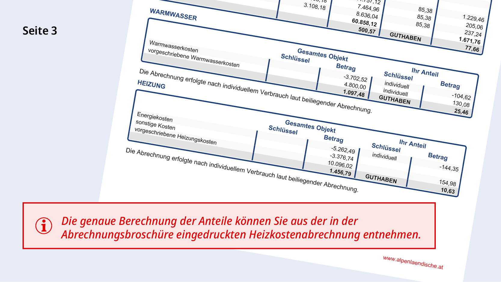 Das Ergebnis der Abrechnung, also das Guthaben oder die Nachzahlung finden Sie auf der zweiten Seite, also der Rückseite der ersten Seite, der Abrechnung.