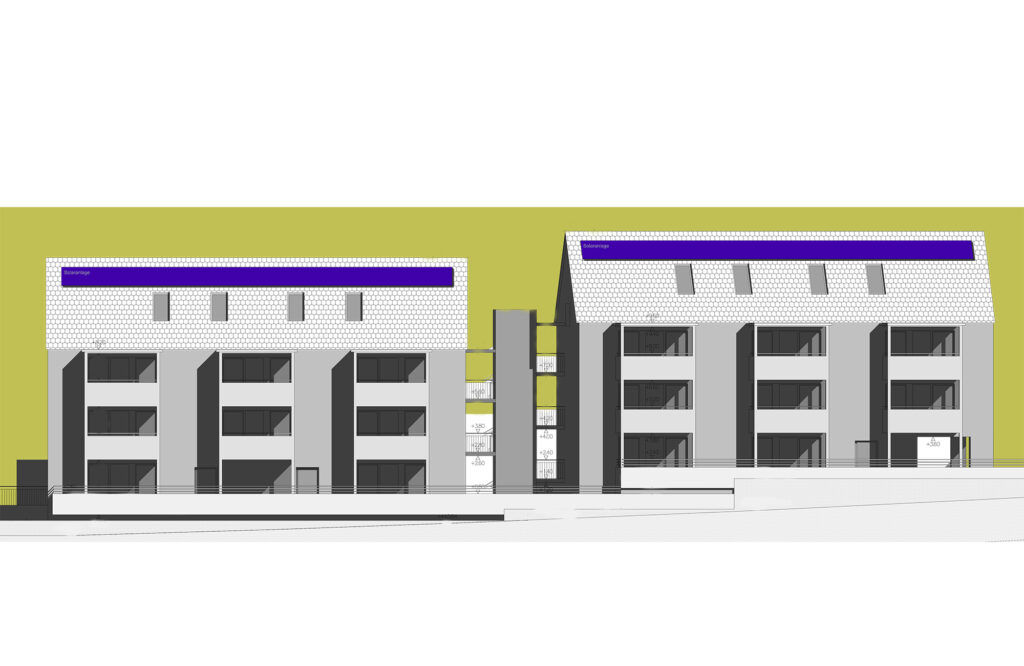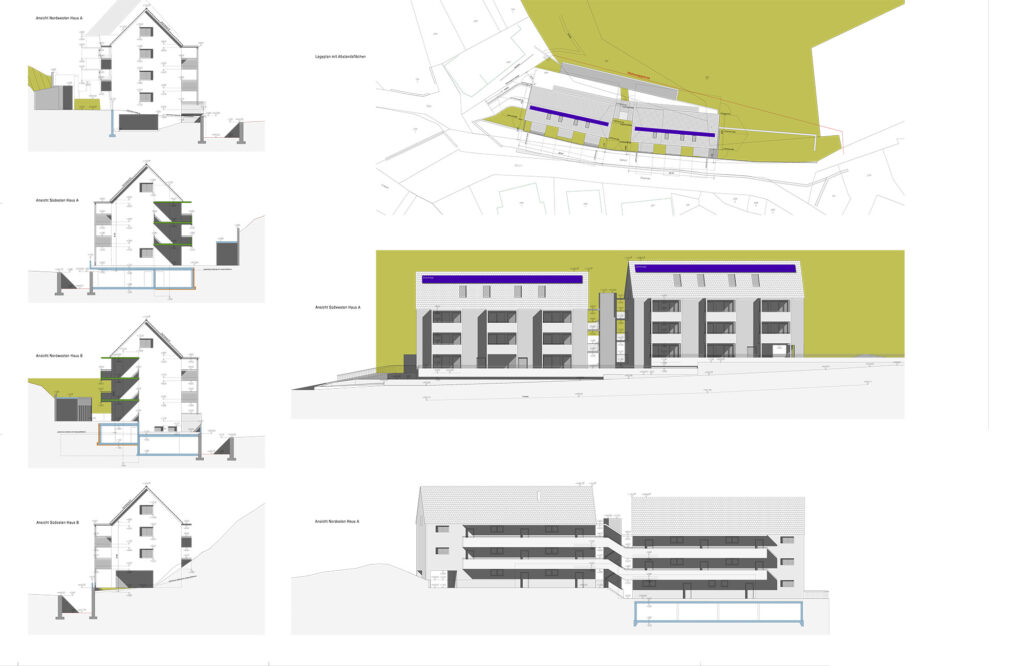 Bei der Wohnanlage handelt es sich um zwei unterkellerte Häuser (Haus A und Haus B), bestehend aus Erdgeschoß, zwei Obergeschoße und dem ausgebauten Dachgeschoß. Jede der Wohnungen verfügt über eine Terrasse oder einen Balkon und im Untergeschoß über ein Kellerabteil.