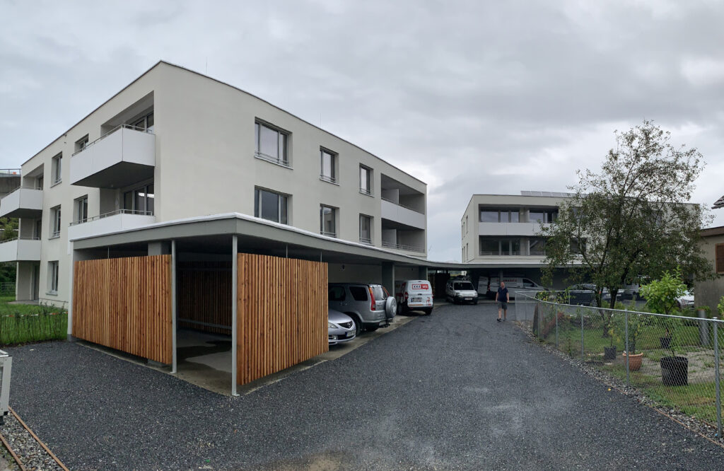 Die Wohnanlage besteht aus zwei Gebäuden, die jeweils über ein Erdgeschoss und 2 Obergeschosse verfügen. Die südlich ausgerichteten Balkone sind in die Fassade integriert. Alle anderen Balkone sowie die Terrassen der Erdgeschosswohnungen kragen dem Gebäude aus.