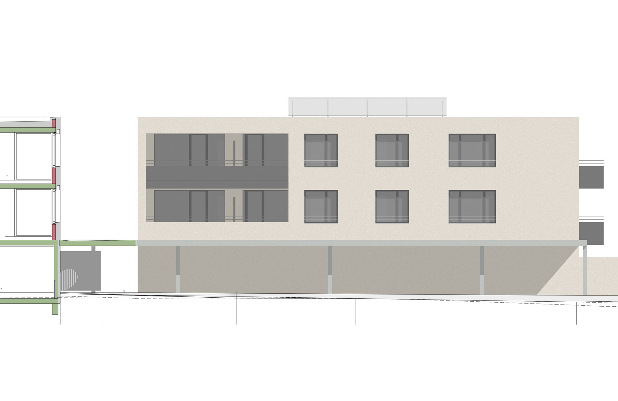 Die Wohnanlage besteht aus zwei Gebäuden, die jeweils über ein Erdgeschoss und 2 Obergeschosse verfügen. Die südlich ausgerichteten Balkone sind in die Fassade integriert. Alle anderen Balkone sowie die Terrassen der Erdgeschosswohnungen kragen dem Gebäude aus.