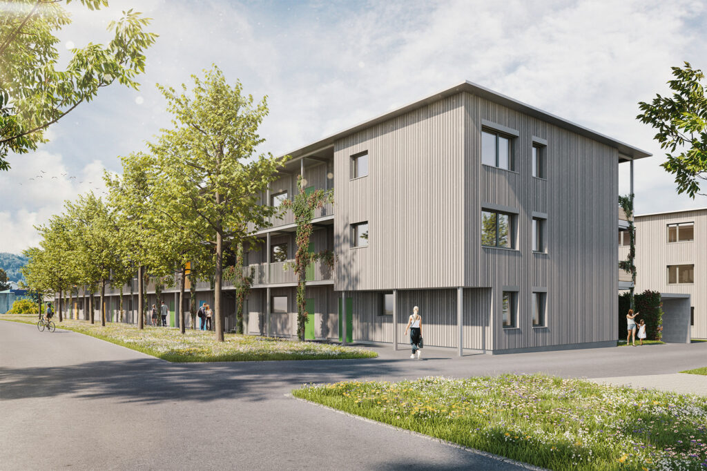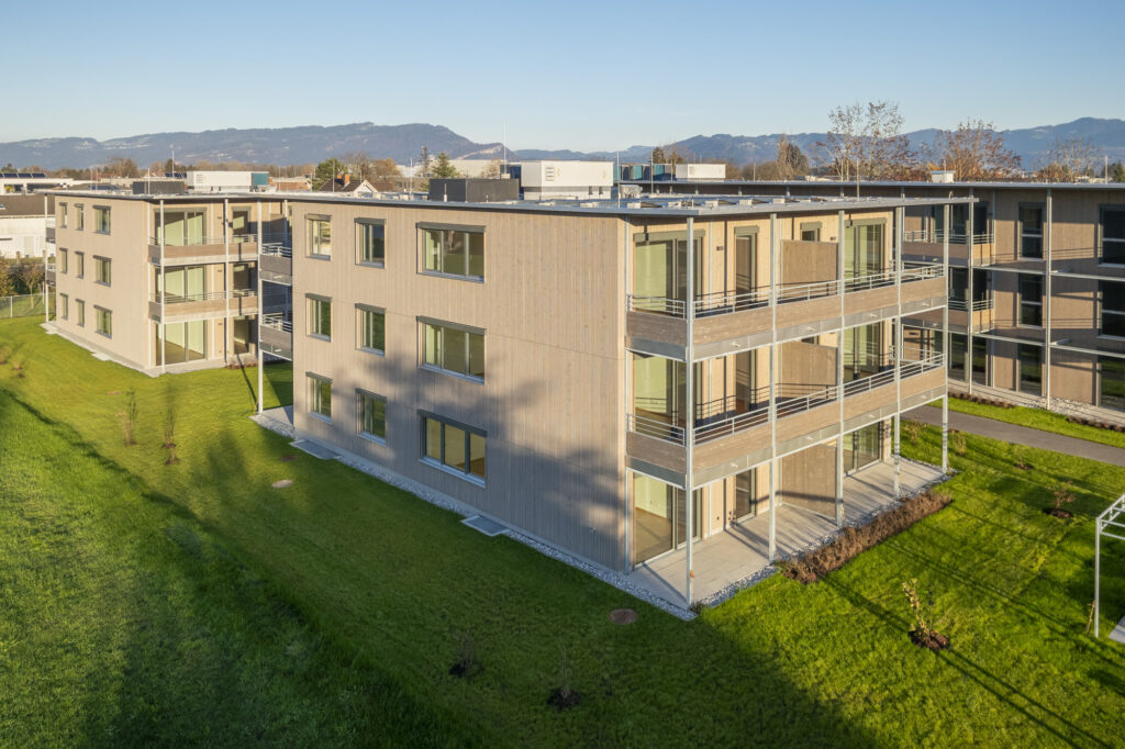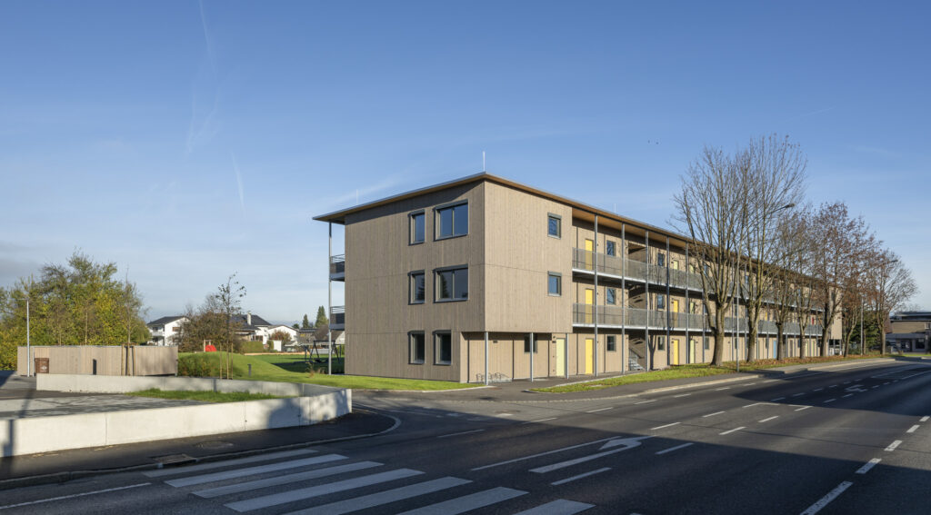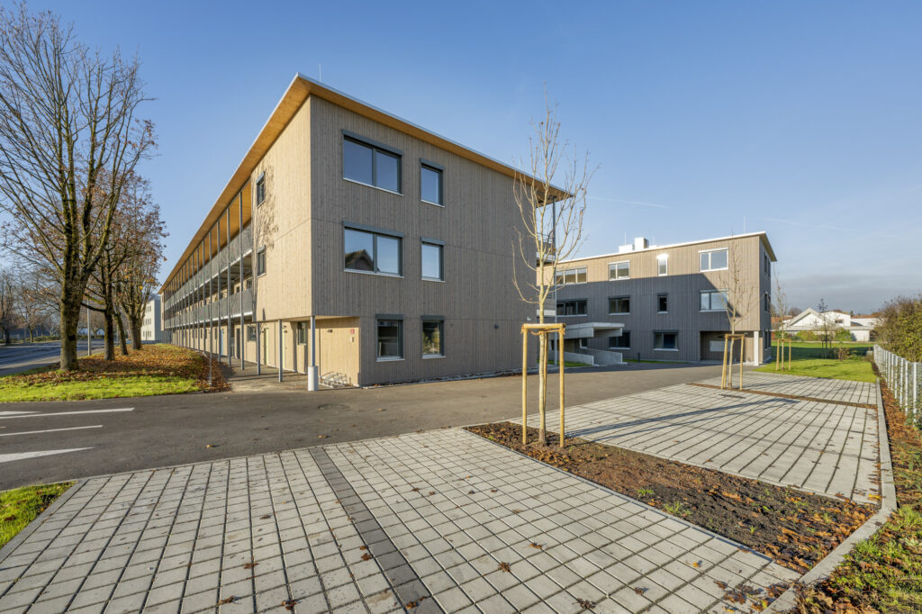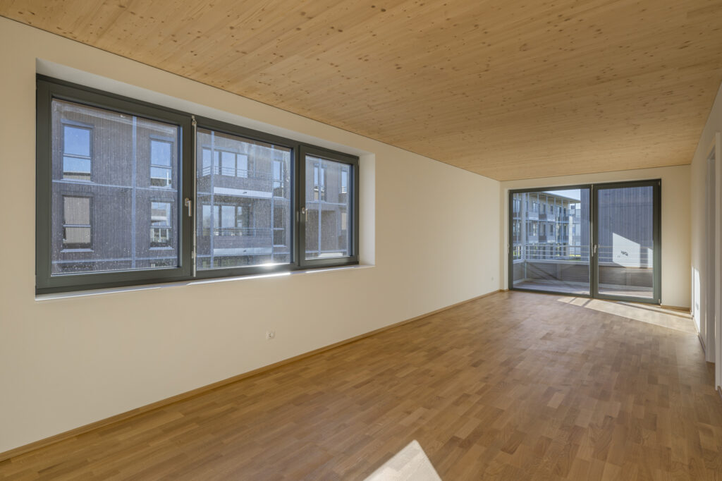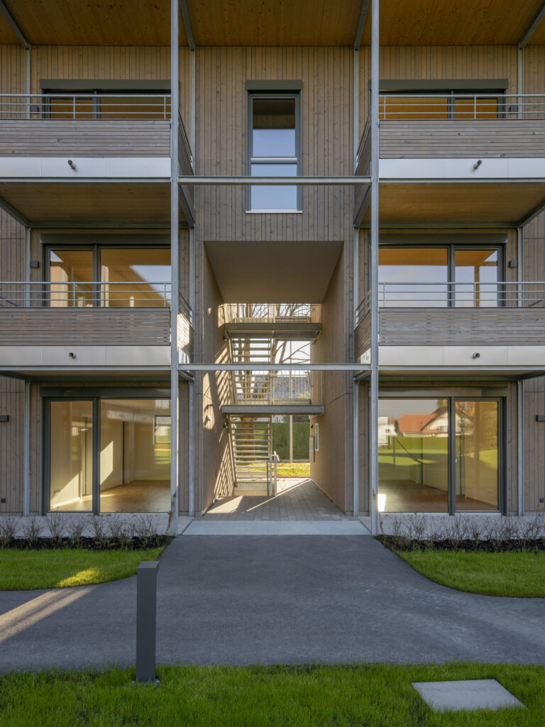 Das Projekt wurde in Holzbauweise mit Holzständerwänden und Massivholzdecken umgesetzt. Auch die Dämmung ist nachhaltig: Bei den Ständerwänden kam eine Zellulose-Einblasdämmung zum Einsatz.
