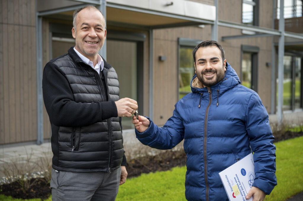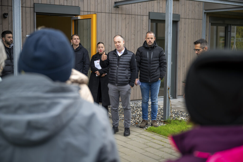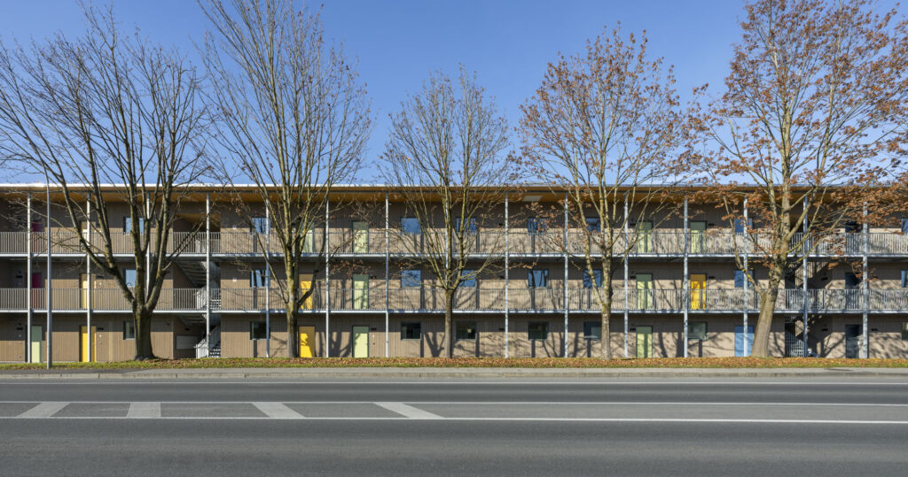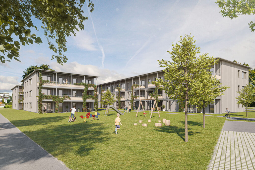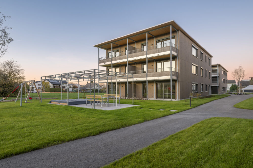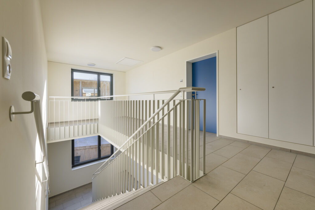 Das Projekt wurde in Holzbauweise mit Holzständerwänden und Massivholzdecken umgesetzt. Auch die Dämmung ist nachhaltig: Bei den Ständerwänden kam eine Zellulose-Einblasdämmung zum Einsatz.