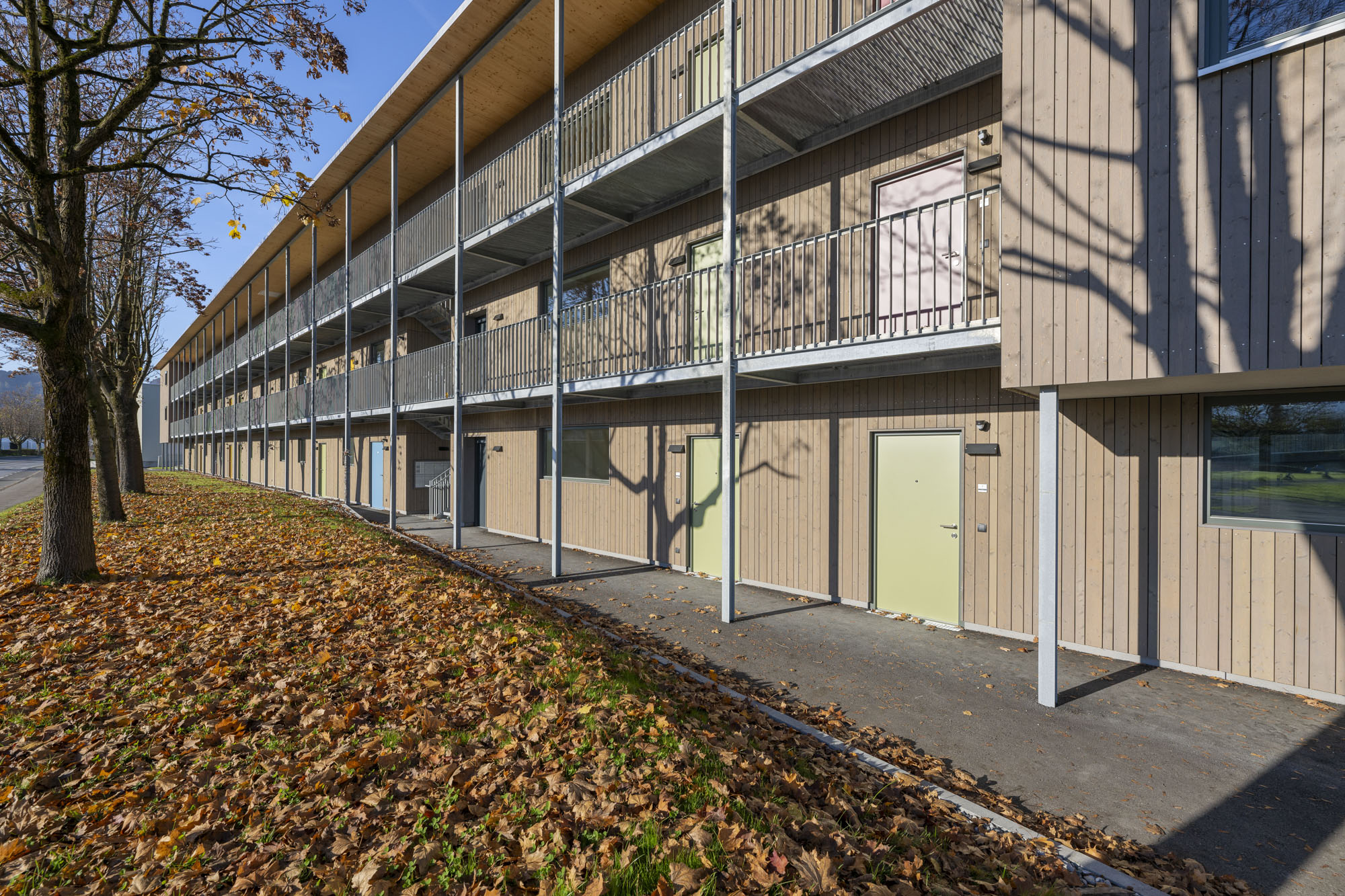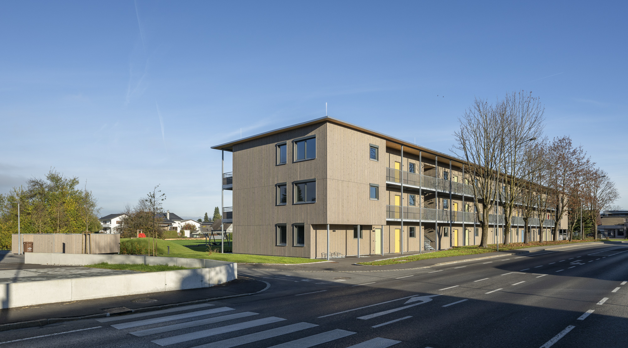 Das Projekt wurde in Holzbauweise mit Holzständerwänden und Massivholzdecken umgesetzt. Auch die Dämmung ist nachhaltig: Bei den Ständerwänden kam eine Zellulose-Einblasdämmung zum Einsatz.