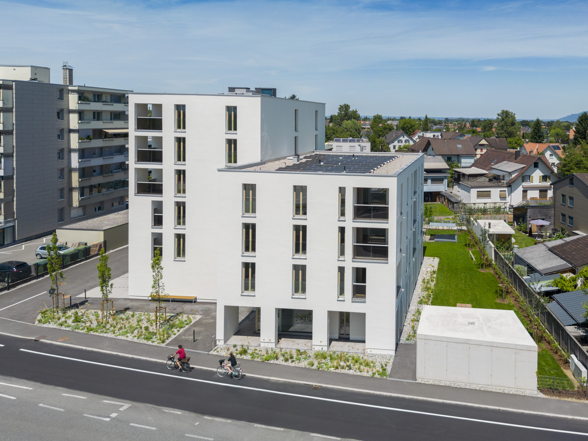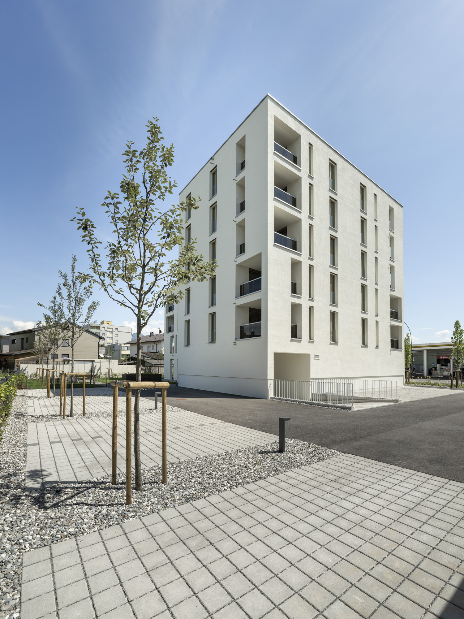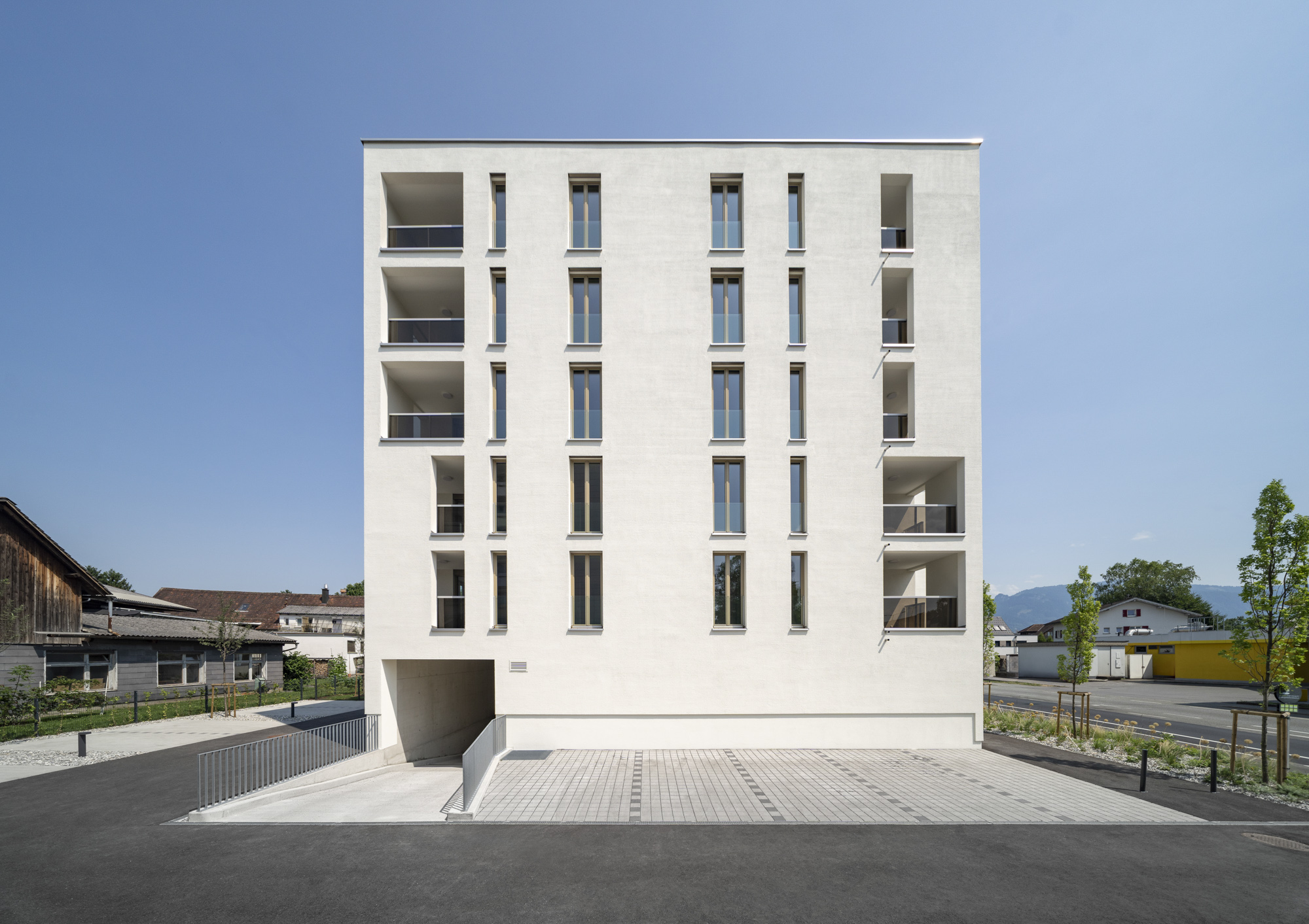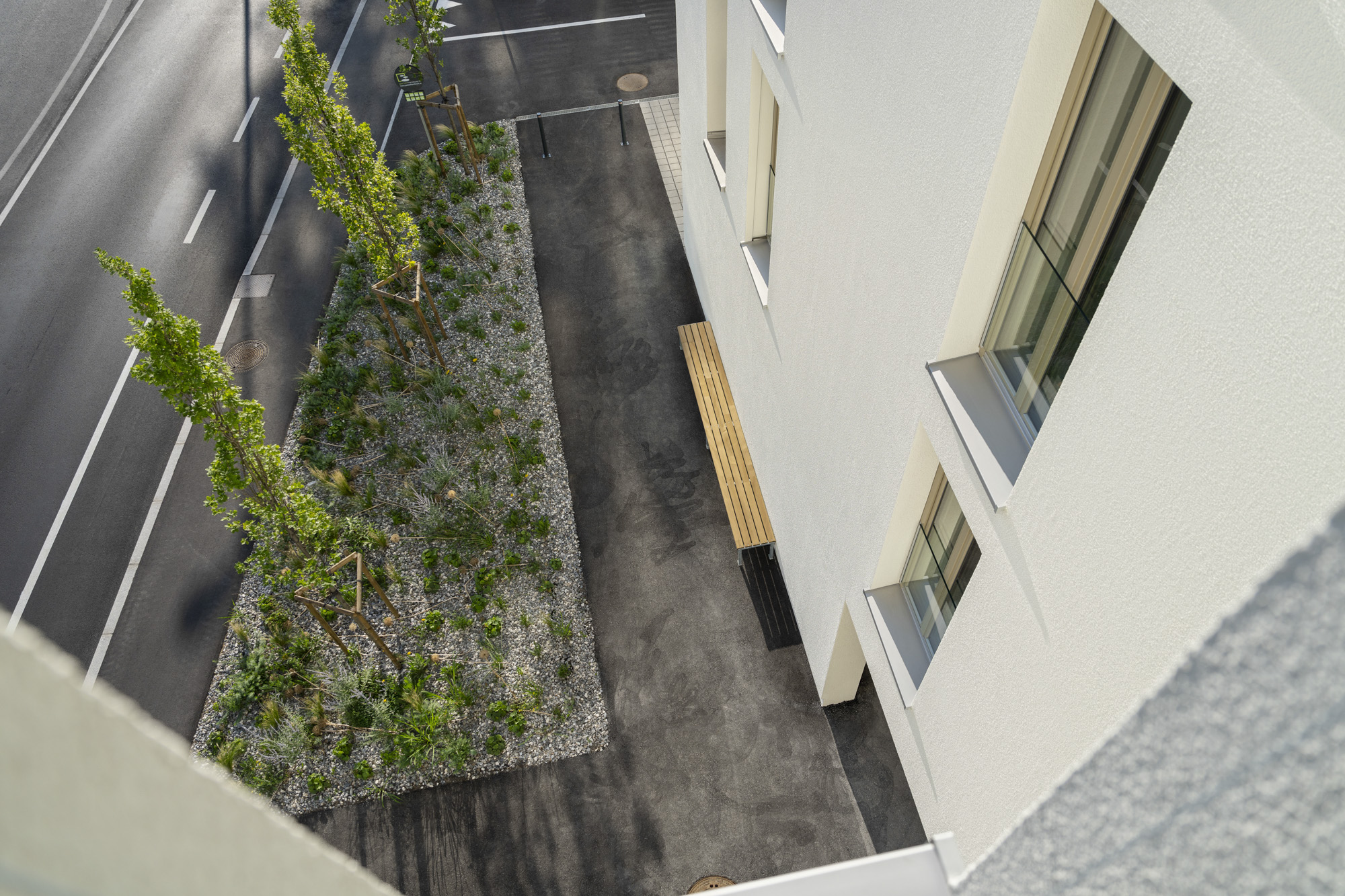 Das Projekt verfügt über ein Erdgeschoss und 3 bzw. 5 Obergeschosse in Massivbauweise mit einem bekiesten Flachdach. Die den Wohnungen zugehörigen Loggien sind in die Gebäudekubatur integriert.