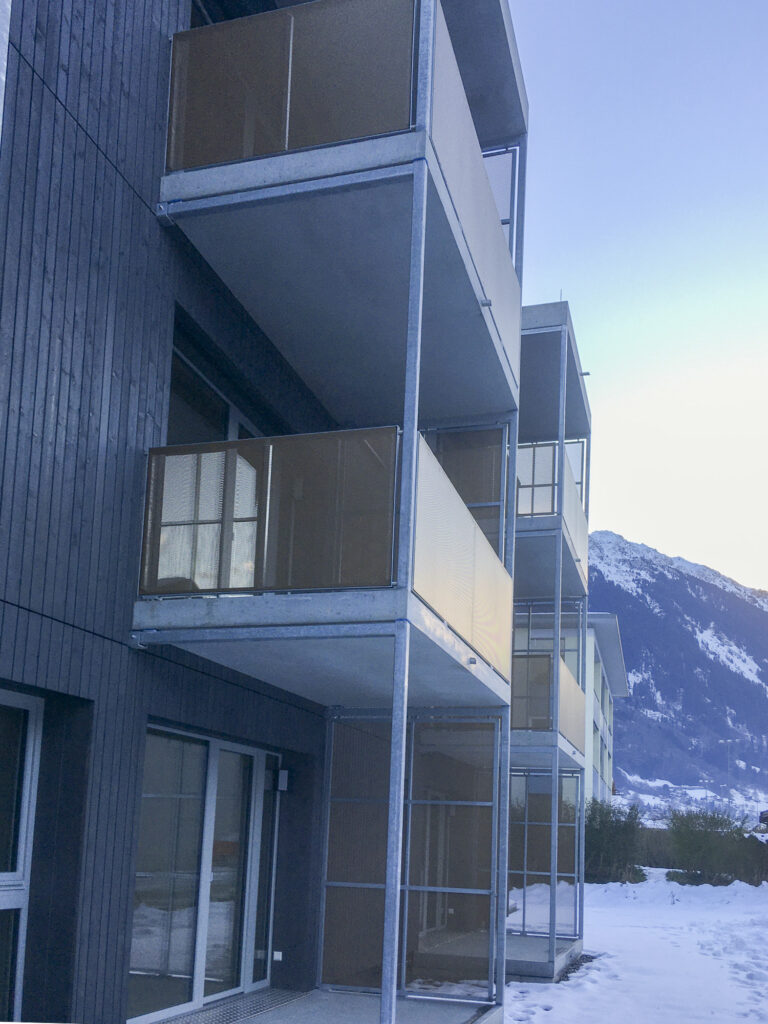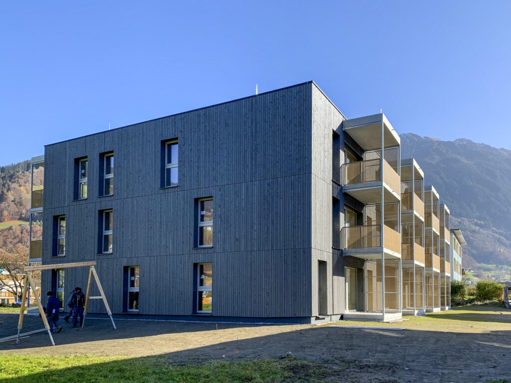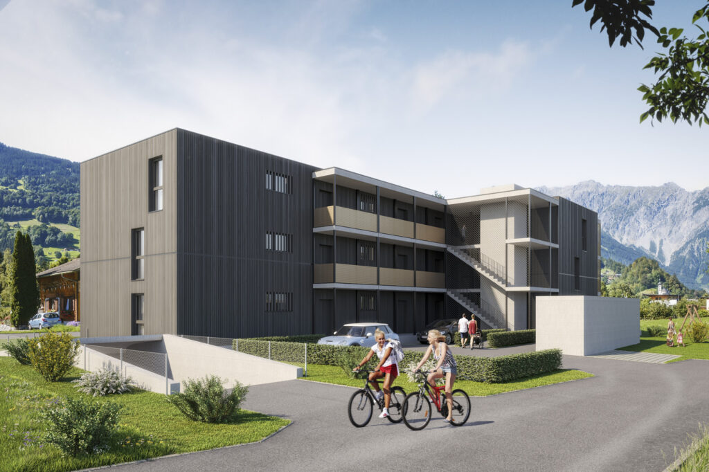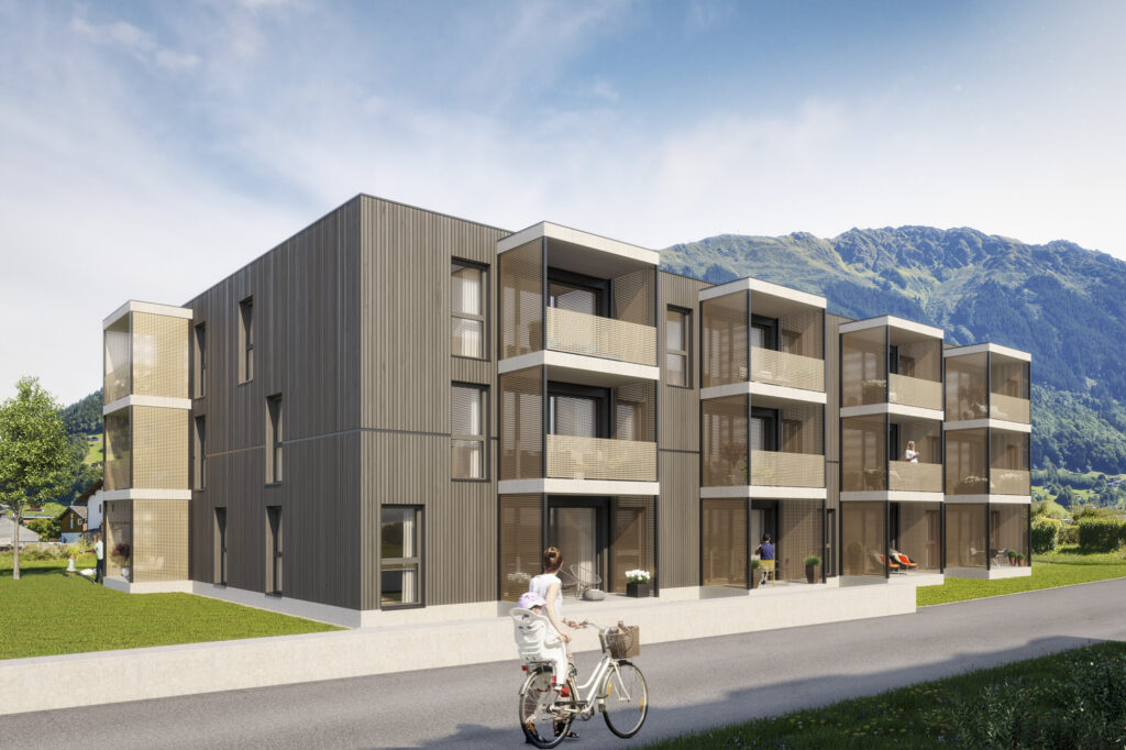 Die Wohnanlage besteht aus einem Gebäude mit 15 Wohneinheiten, 15 Tiefgaragenplätzen und 5 KFZ-Abstellplätzen im Freien. Das Untergeschoss wird in Massivbauweise ausgeführt, das Erd- und die beiden Obergeschosse in Holz-Modulbauweise. Die Holzfassade aus Fichte mit den auskragenden Balkonen und die Erschließung der Wohnungen über Laubengänge prägen das Bild der Wohnanlage.