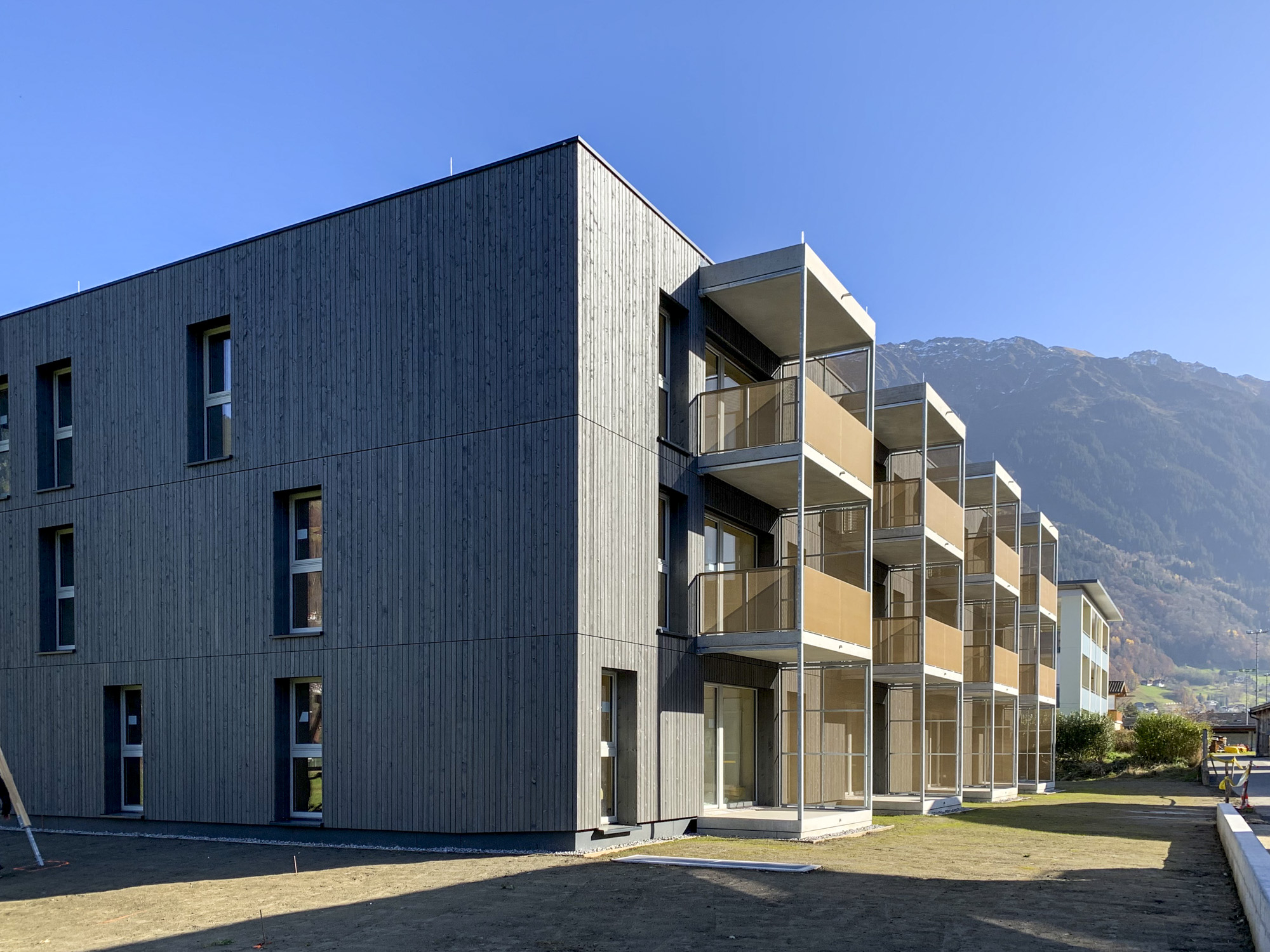 Die Wohnanlage besteht aus einem Gebäude mit 15 Wohneinheiten, 15 Tiefgaragenplätzen und 5 KFZ-Abstellplätzen im Freien. Das Untergeschoss wird in Massivbauweise ausgeführt, das Erd- und die beiden Obergeschosse in Holz-Modulbauweise. Die Holzfassade aus Fichte mit den auskragenden Balkonen und die Erschließung der Wohnungen über Laubengänge prägen das Bild der Wohnanlage.