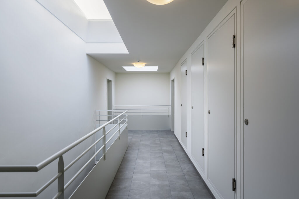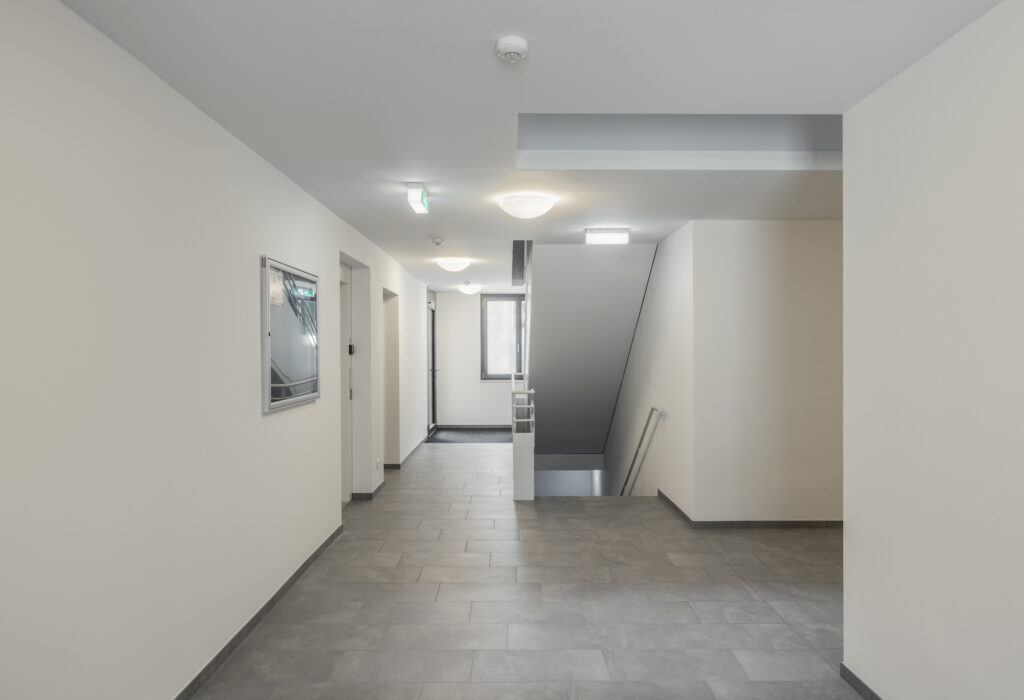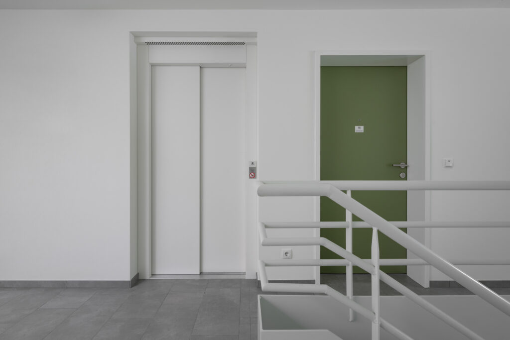 Die Wohnanlage besteht aus einem Gebäude mit 16 Wohneinheiten, 16 Tiefgaragenplätze und sieben KFZ-Abstellplätze im Freien. Das Gebäude ist unterkellert und verfügt über ein Erdgeschoss und zwei Obergeschosse in Massivbauweise mit einem bekiesten Flachdach. Die den Wohnungen zugehörigen Balkone sind in die Gebäudekubatur integriert. Die vertikale Erschließung erfolgt durch ein geschlossenes Stiegenhaus, wobei Lichtkuppeln und „Lichtschächte“ Tageslicht bis in das Erdgeschoß bringen. Neben der Treppe sind die Geschoße des Gebäudes auch mit einem Personenaufzug erschlossen.