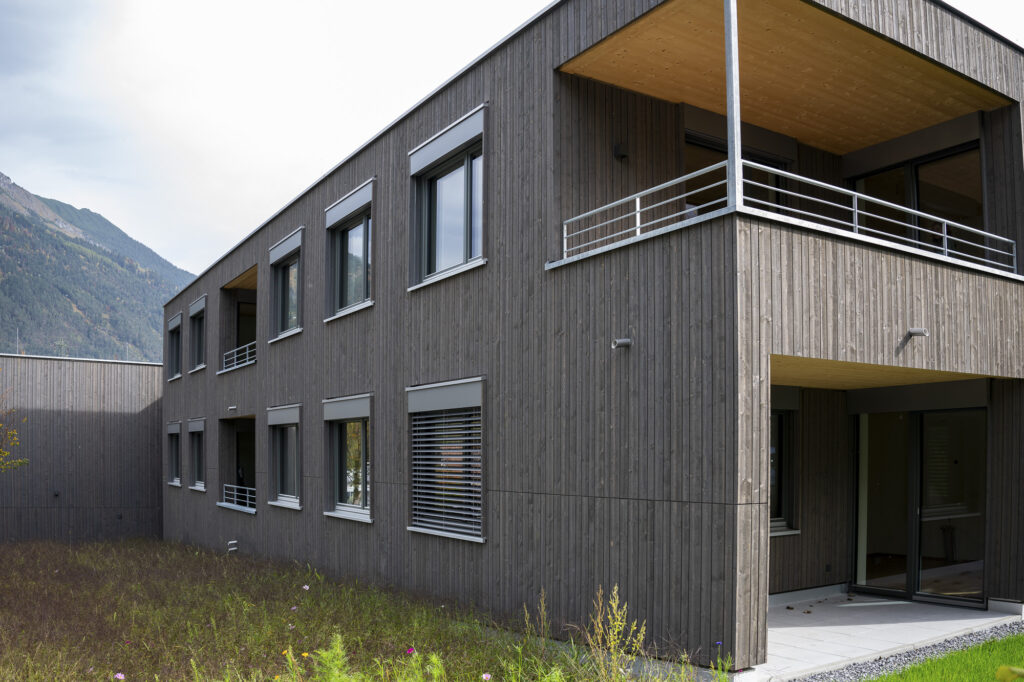 Die beiden schlichten Baukörper mit Flachdach liegen sanft eingebettet in einem Hang und gliedern sich perfekt in die Umgebung ein. Das Kellergeschoß wurde in Massivbauweise ausgeführt, das restliche Gebäude ab dem Erdgeschoß samt Fassade und Liftschacht in Holzbauweise. Das Treppenhaus wurde als Stahlkonstruktion dazwischen gehängt. Neben ausreichenden Parkmöglichkeiten können sich die neuen Bewohner über einen Kinderspielplatz, allgemeine Grün- und Abstellflächen und schöne Terrassen bzw. Balkone freuen. Das Projekt ist bereits die fünfte Wohnanlage der Alpenländischen in Bürs.